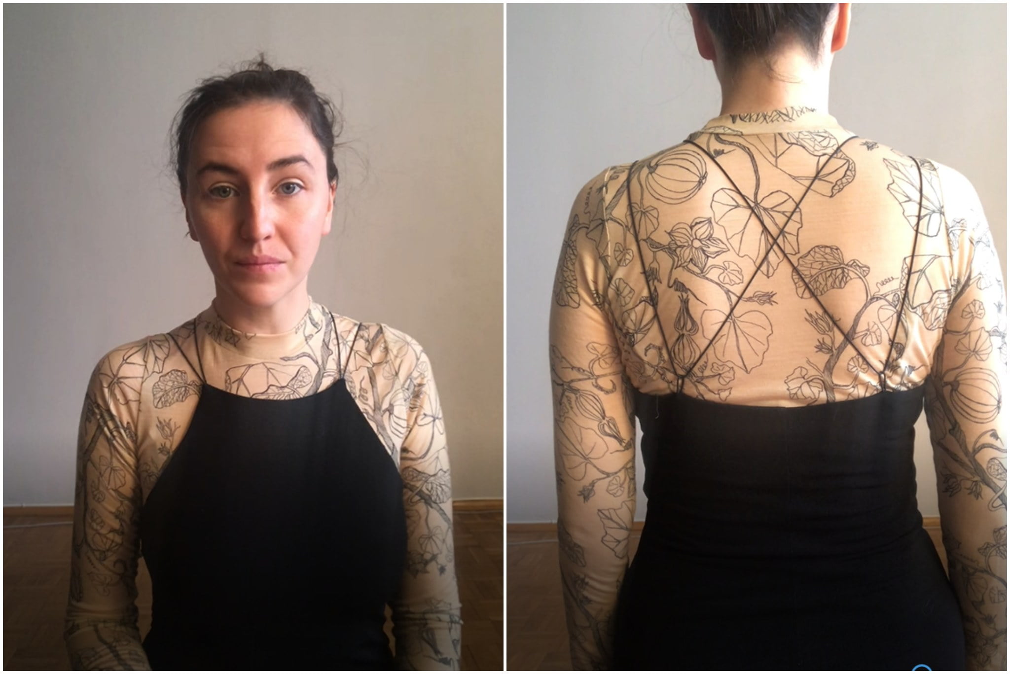 To body ma beżowy kolor, który imituje skórę i delikatny, botaniczny wzór, jakby namalowany tuszem na ciele, który przypomina tatuaże.