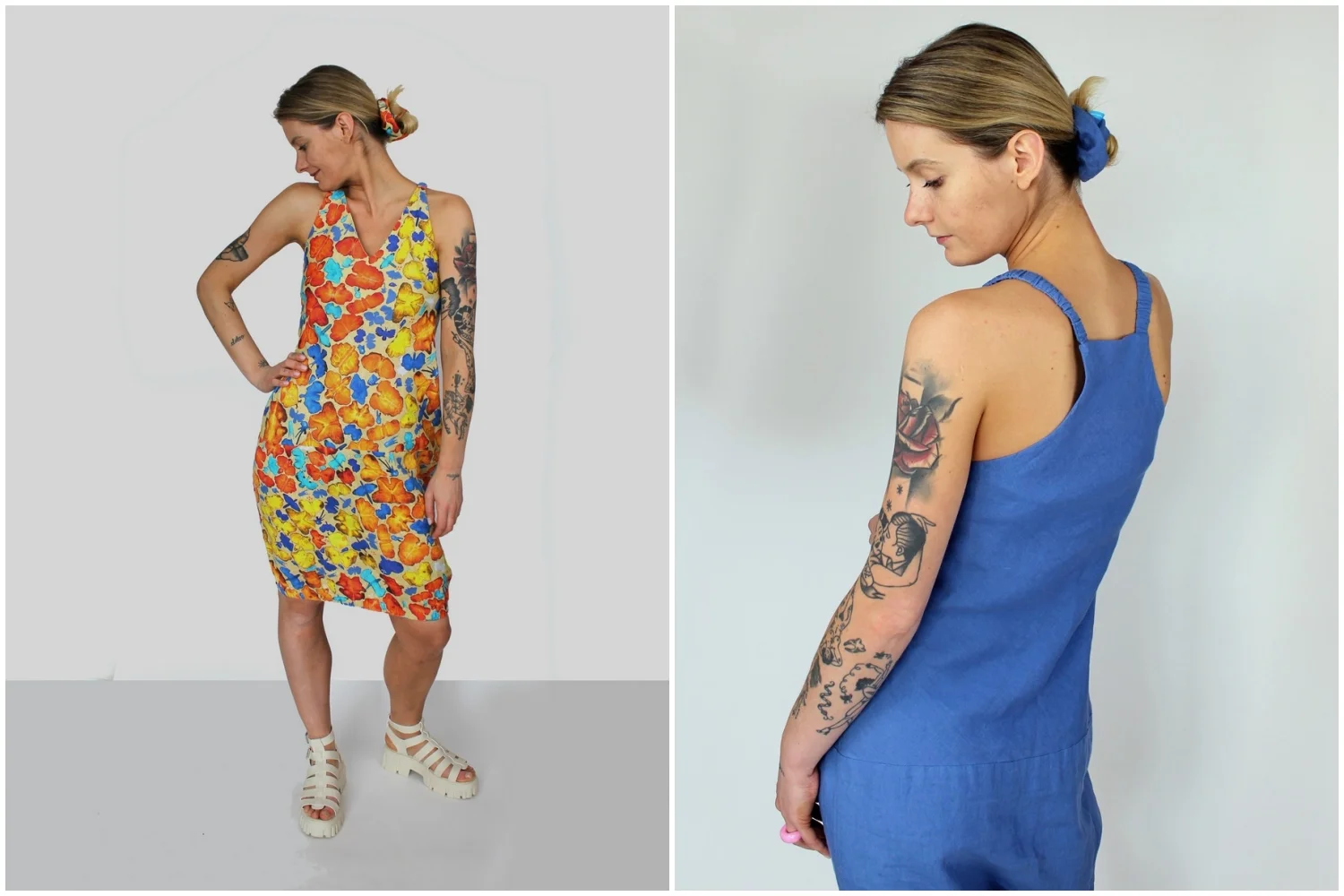 W kolekcji znalazły się dwa kroje sukienek. Jedna to sukienka na ramiączkach, z przepięknie wyciętymi plecami. Ramiączka mają wszytą gumkę, dzięki czemu nie wpijają się nieprzyjemnie w skórę i bardzo ładnie się prezentują, są lekko marszczone.