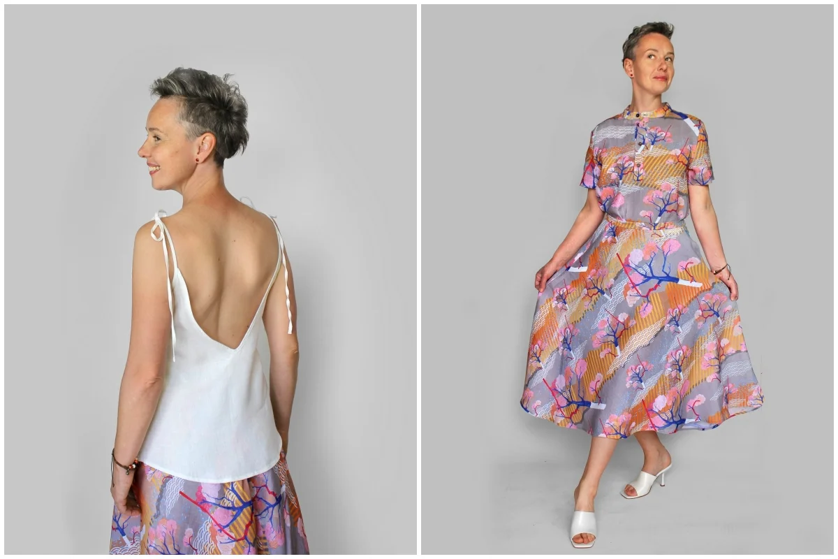 Biały top czy koszula pasować będzie do wszystkiego. A spódnica w japoński wzór sakaido doskonale połączy się z niebieską koszulą ze stójką.
