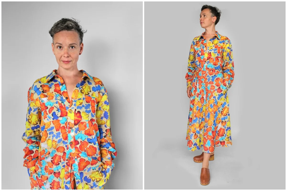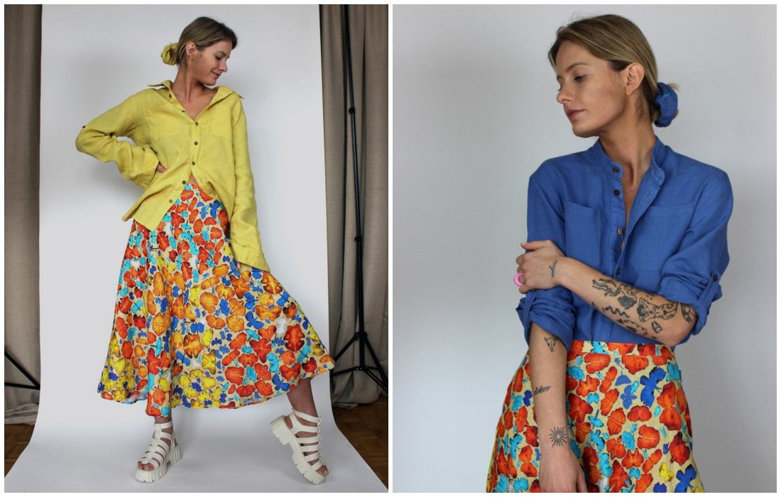 Kiedy tworzyłam wzór papilio zamarzyło mi się połączenie drobnych motylków z dużymi, bardziej graficznymi motylami. Powiększyłam motyle z kleksów, zamieniłam je na negatyw, żeby były jeszcze mniej realne. Dodałam do nich żółte tło, które pięknie podkreśla ich kolory i kształty. I tak właśnie powstał wzór paternfly, który widzicie na lnianych spódnicach, sukienkach, topach i koszulach.