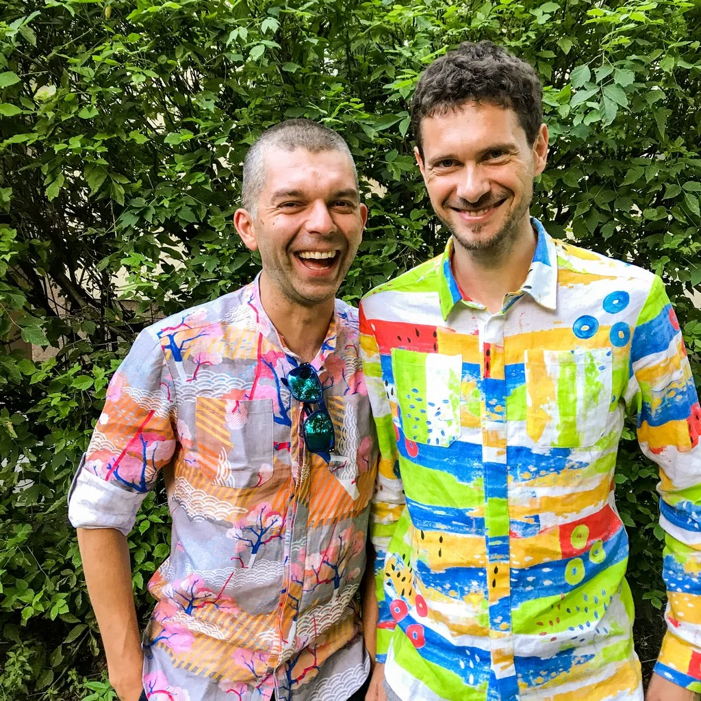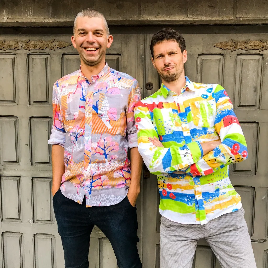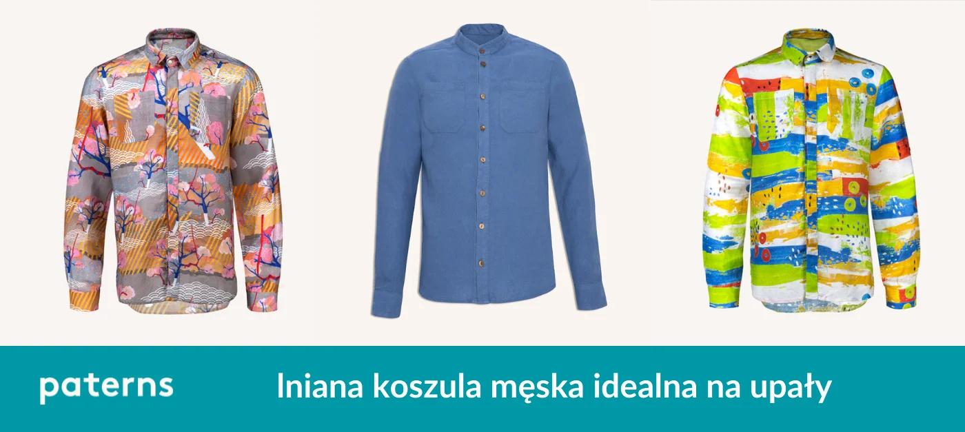 Do lnianych spodenek w kolorze niebieskim wybierz koszulę w kolorze białym, żółtym, lub kolorową koszulę we wzory. Do wyboru mamy dwie kolorowe koszule lniane we wzory, oba namalowane przez właścicielkę marki paterns, malarkę Katarzynę Lamik. Bardziej ekscentryczny kolorowy wzór w motyle lub raczej stonowany wzór sakaido, zainspirowany japońskimi grafikami.