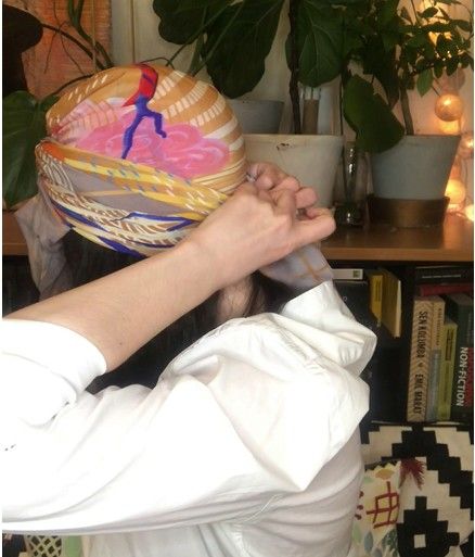 8. Ciągnąc za dwa rogi, które zostały nam na twarzy, możemy regulować, czy turban ciasno będzie oplatał głowę, czy nie. Jak pociągniecie za nie mocniej, to turban będzie ciaśniejszy.