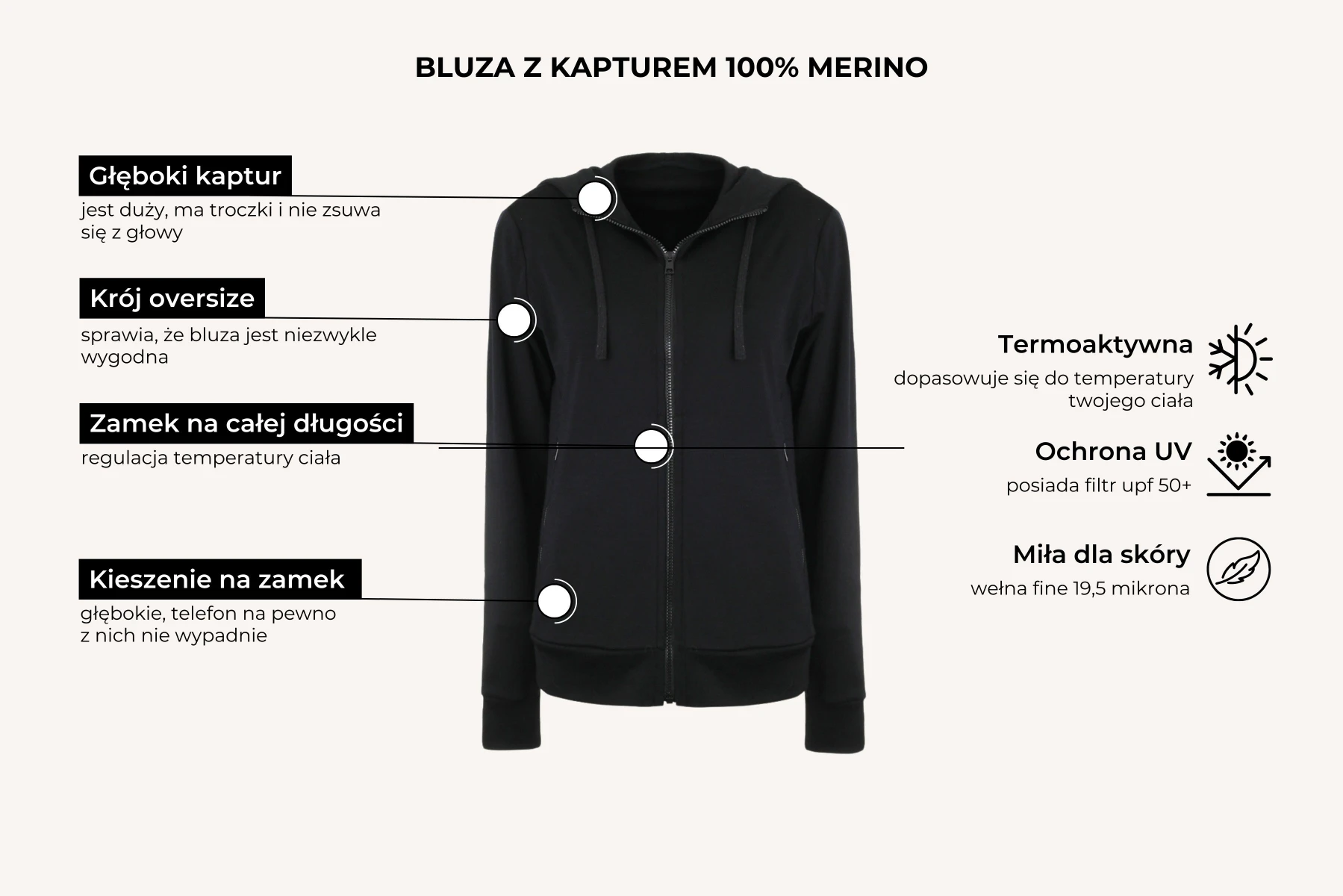 - Ciepło: Merino jest niezwykle efektywne pod względem izolacji cieplnej. Nawet cienka, lekka bluza doskonale Cię ogrzeje.