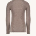 Bielizna termoaktywna z wełny merino 100% damska góra beżowa, z długim rękawem i stójką nie tylko zapewni Ci niezrównany komfort termiczny w zimne dni, ale także doskonale sprawdzi się jako funkcjonalna odzież sportowa.