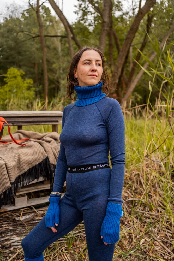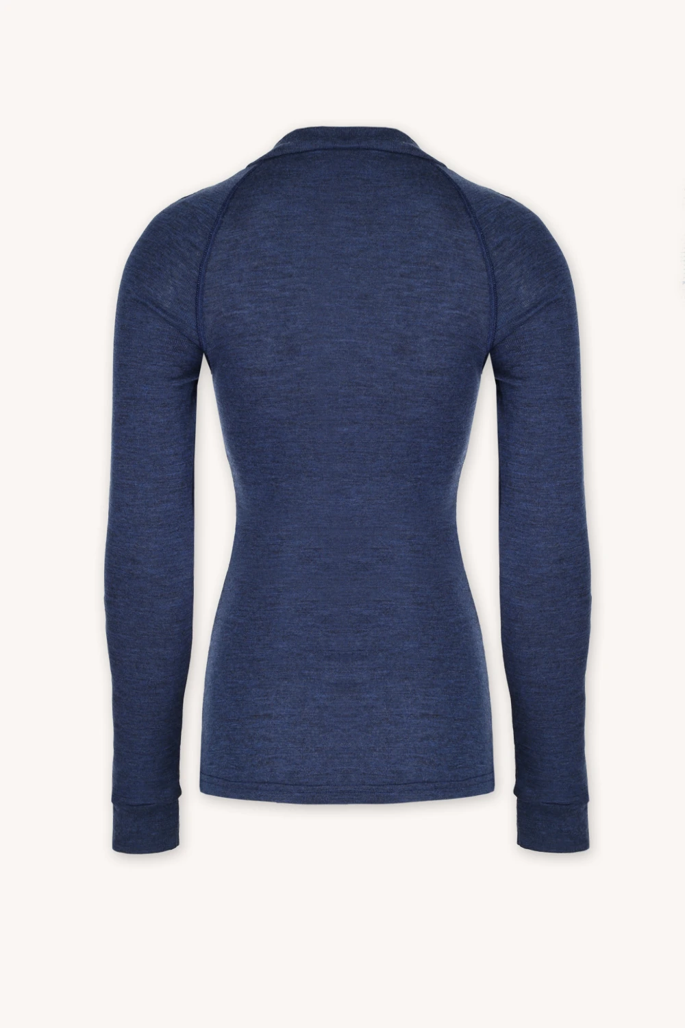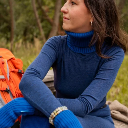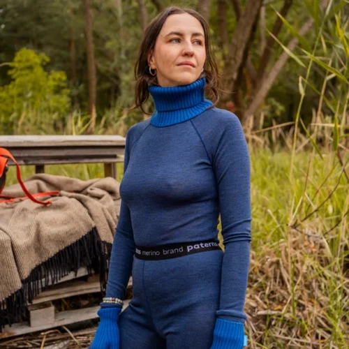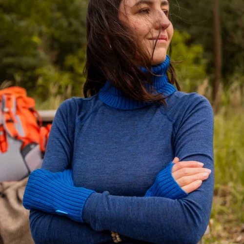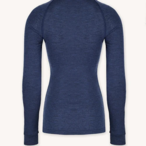 Bielizna termoaktywna z wełny merino 100% damska góra w granatowym kolorze, z długim rękawem i stójką nie tylko zapewni Ci niezrównany komfort termiczny w zimne dni, ale także doskonale sprawdzi się jako funkcjonalna odzież sportowa.