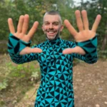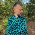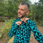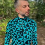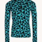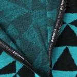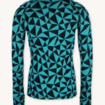 Bardzo ciepła, termoaktywna koszulka z wełny merino z długim rękawem z suwakiem przy dekolcie, we wzór w turkusowo-czarne trójkąty. Góra bielizny męskiej 100% z wełny merino sprawdzi się doskonale podczas jesiennych trekkingów albo jako warstwa dogrzewająca pod narciarski kombinezon.