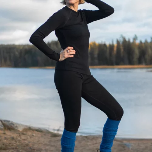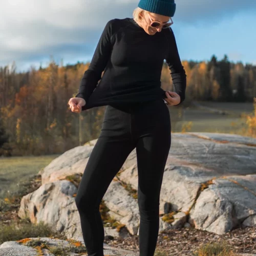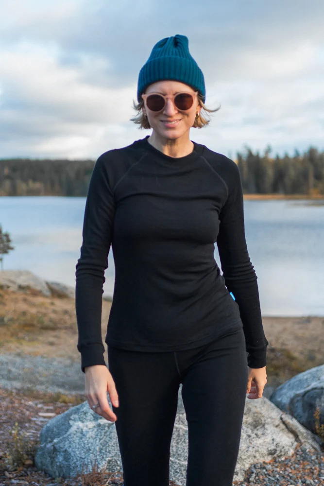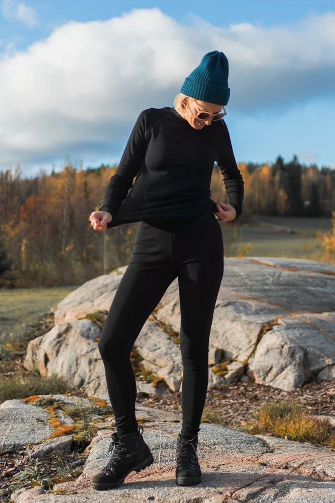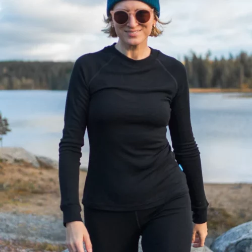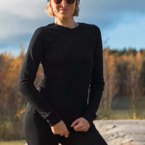 Bielizna termoaktywna z wełny merino 100% damska góra czarna, z długim rękawem i stójką nie tylko zapewni Ci niezrównany komfort termiczny w zimne dni, ale także doskonale sprawdzi się jako funkcjonalna odzież sportowa.