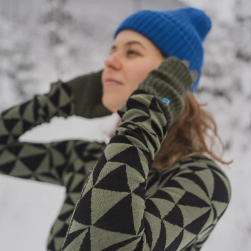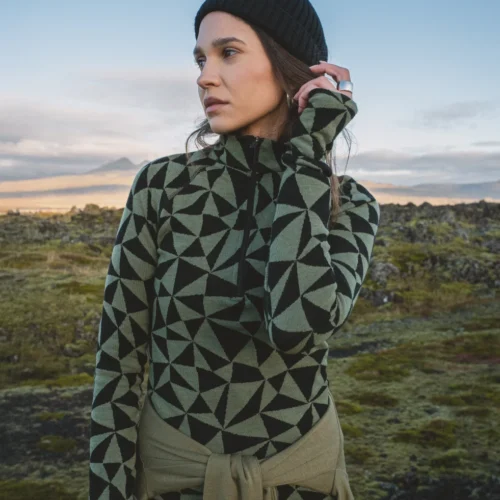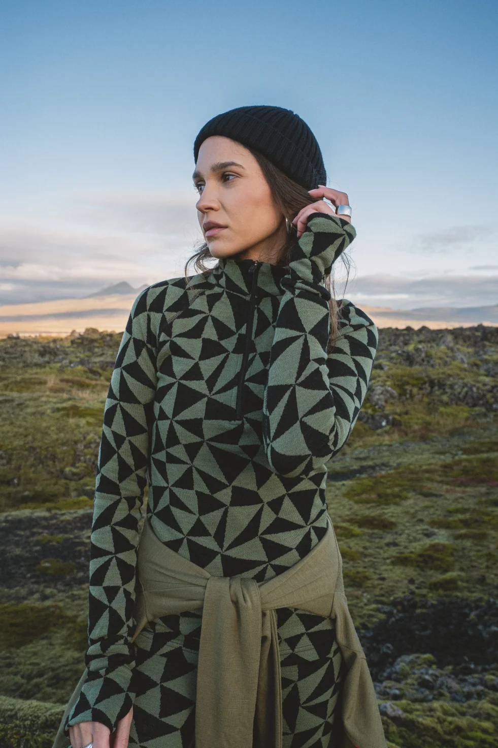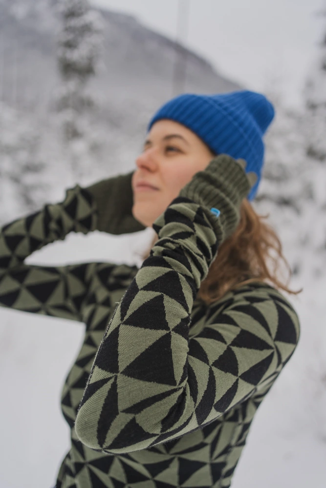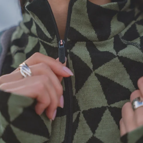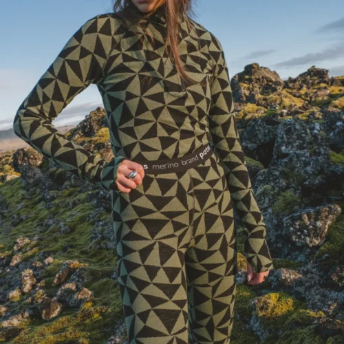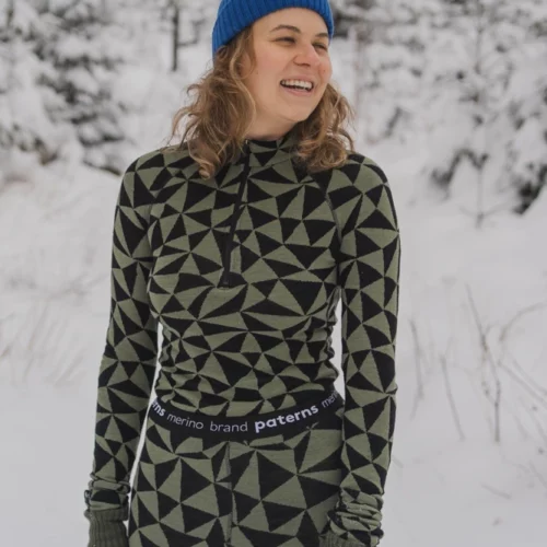 Bardzo ciepła, termoaktywna koszulka z wełny merino z długim rękawem z suwakiem przy dekolcie, we wzór w oliwkowo-czarne trójkąty. Góra bielizny 100% z wełny merino sprawdzi się doskonale podczas jesiennych trekkingów albo jako warstwa dogrzewająca pod narciarski kombinezon.