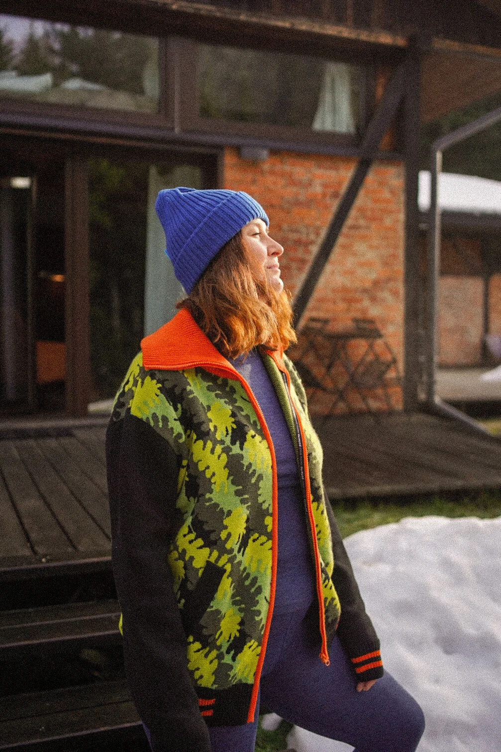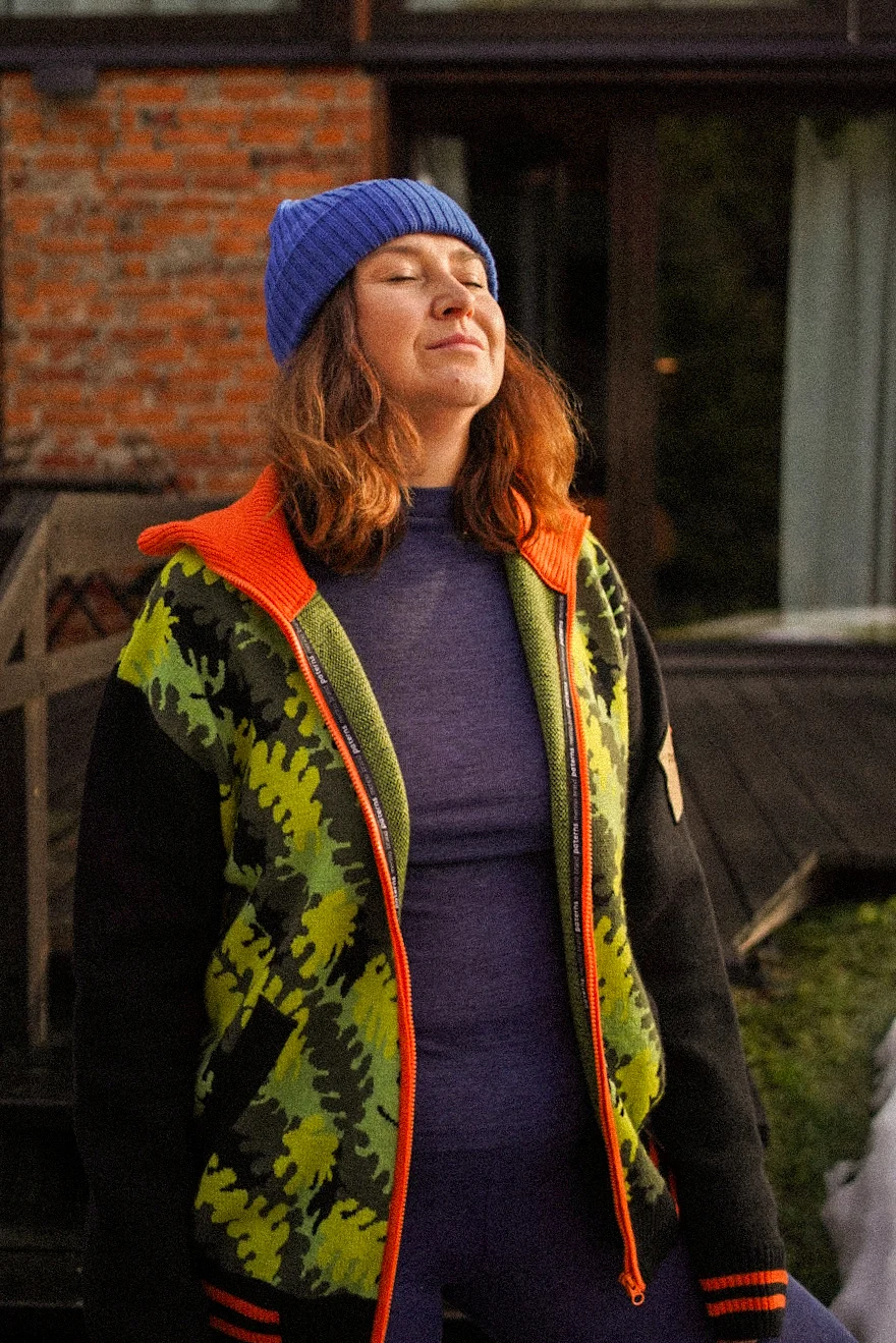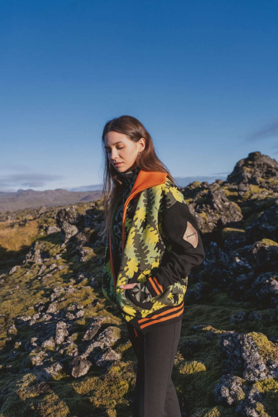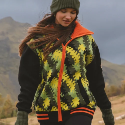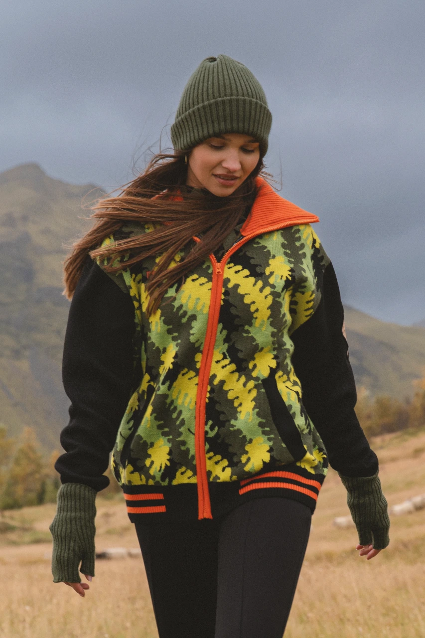 Ta bomberka została wykonana z 100% wełny merino techniką żakardu. Żakardowy splot tworzy niepowtarzalny wzór liści dębu w intensywnych, energetyzujących barwach.