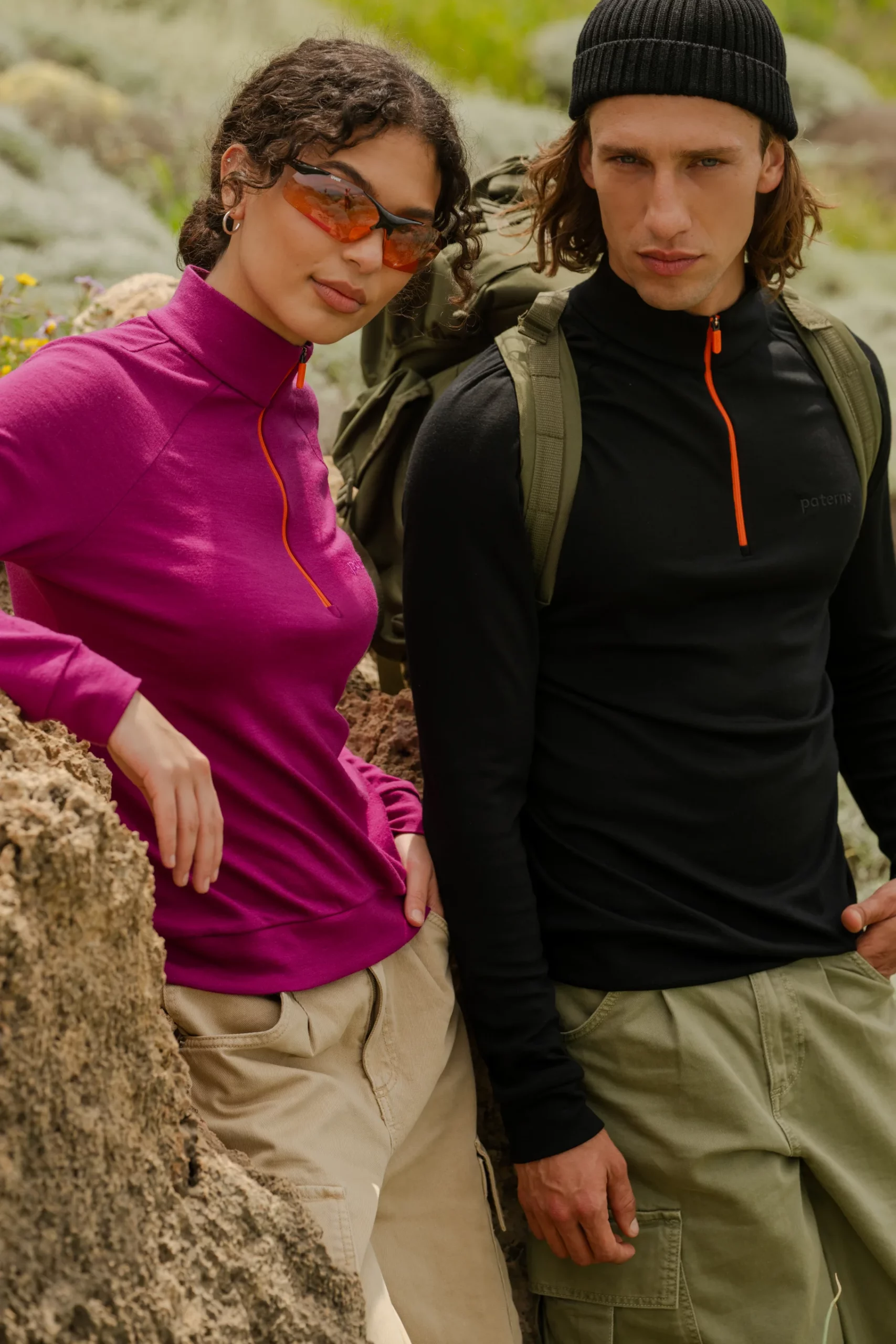 Wełna merino działa jak naturalna „inteligentna tkanina” – grzeje, gdy jest zimno, chłodzi, gdy jest ciepło, i doskonale odprowadza wilgoć, pozostawiając skórę suchą. Dodatkowo nie chłonie zapachów, więc możesz ją nosić nawet przez kilka dni bez prania.