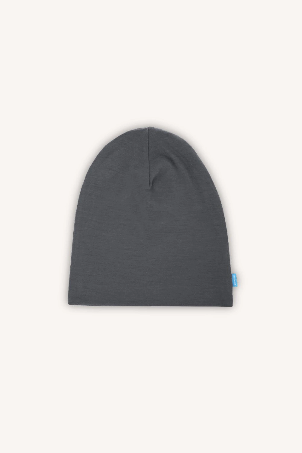 Cienka szara czapka z wełny merino dla dorosłych. Szyta z podwójnej warstwy cienkiej dzianiny z wełny merino.