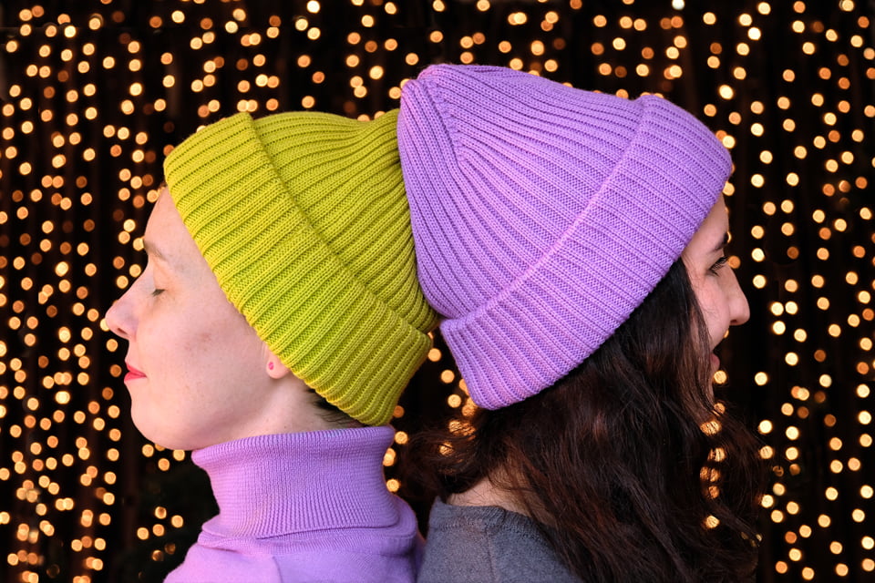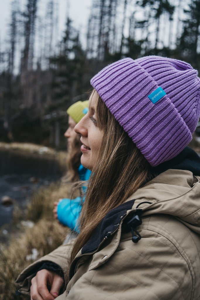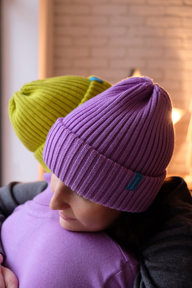 Fioletową czapkę można nosić na dwa sposoby. Jeśli chcesz szczególnie chronić uszy, można podwinąć mankiet dwa razy. Wtedy czapka jest płytsza, ale mamy aż trzy warstwy wełny merino na uszach. Fioletową czapkę można nosić też z mankietem wywiniętym tylko raz. Wtedy jest bardziej luźna. Zmieścisz pod nią nawet kok zawiązany wysoko na głowie.