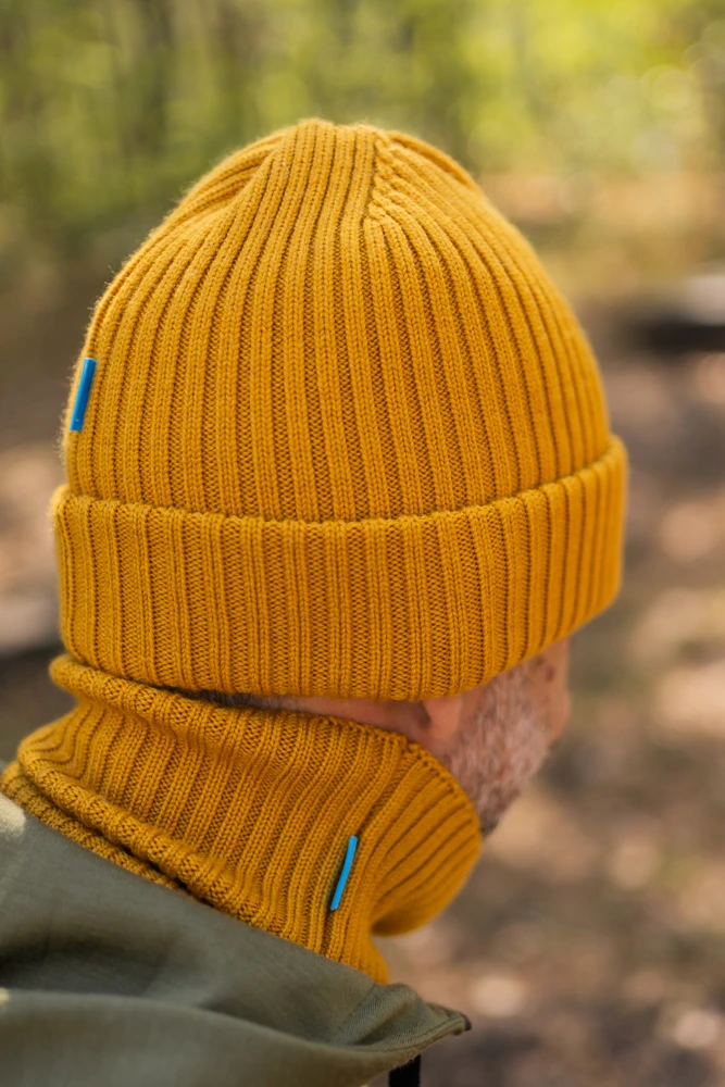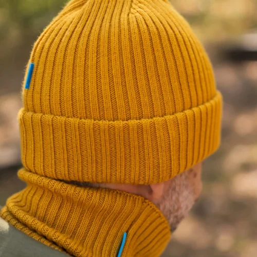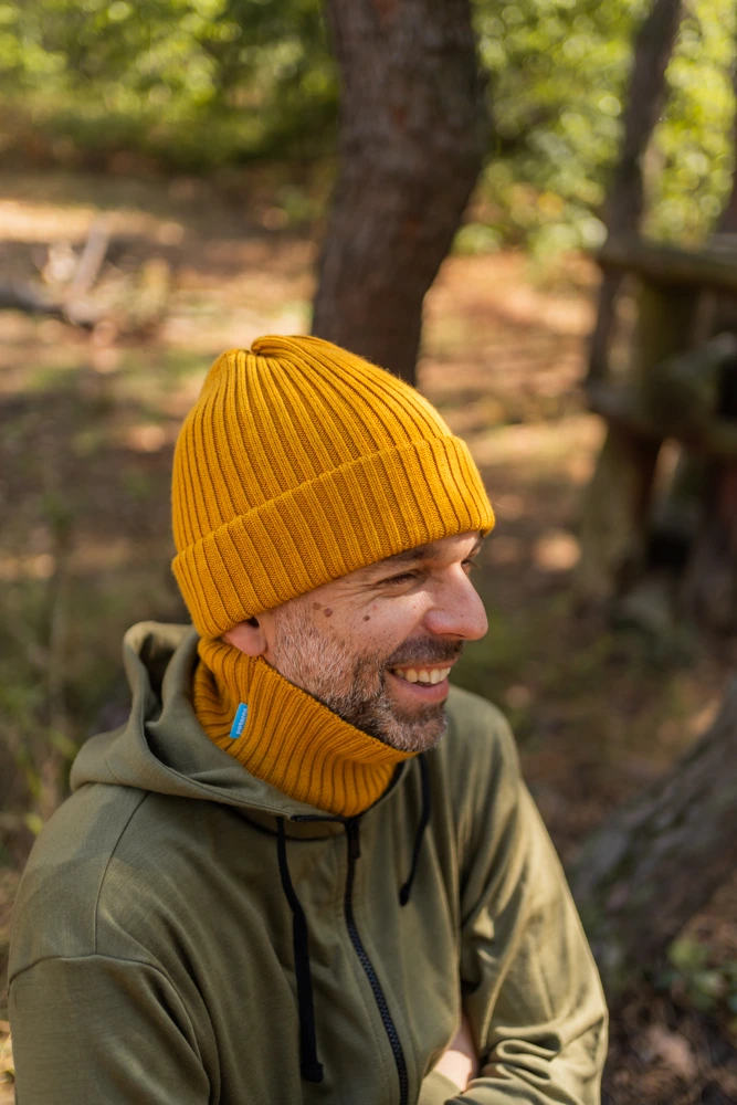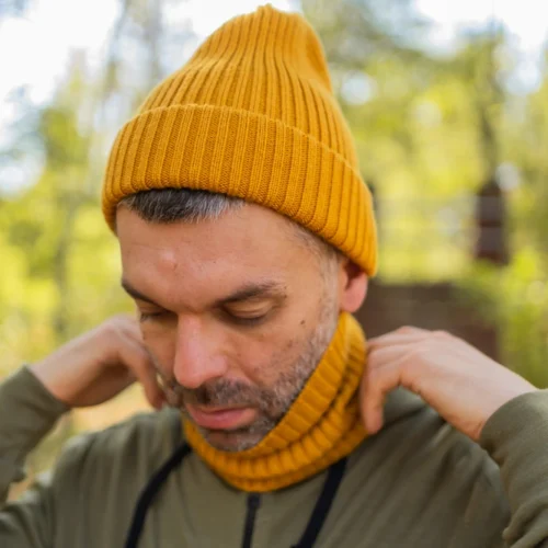 Żółtą czapkę z wełny merino możesz nosić na dwa sposoby. Mankiet może być zawinięty raz. Wtedy czapka z merynosów jest luźniejsza, zmieścisz pod nią kucyk. Jeśli wolisz płytkie czapki, możesz mankiet wywinąć dwukrotnie. Wtedy aż trzy warstwy wełny merino będą chroniły uszy przed zimnem i wiatrem.