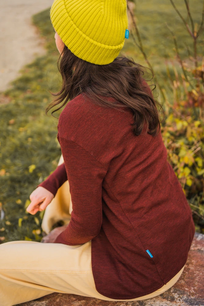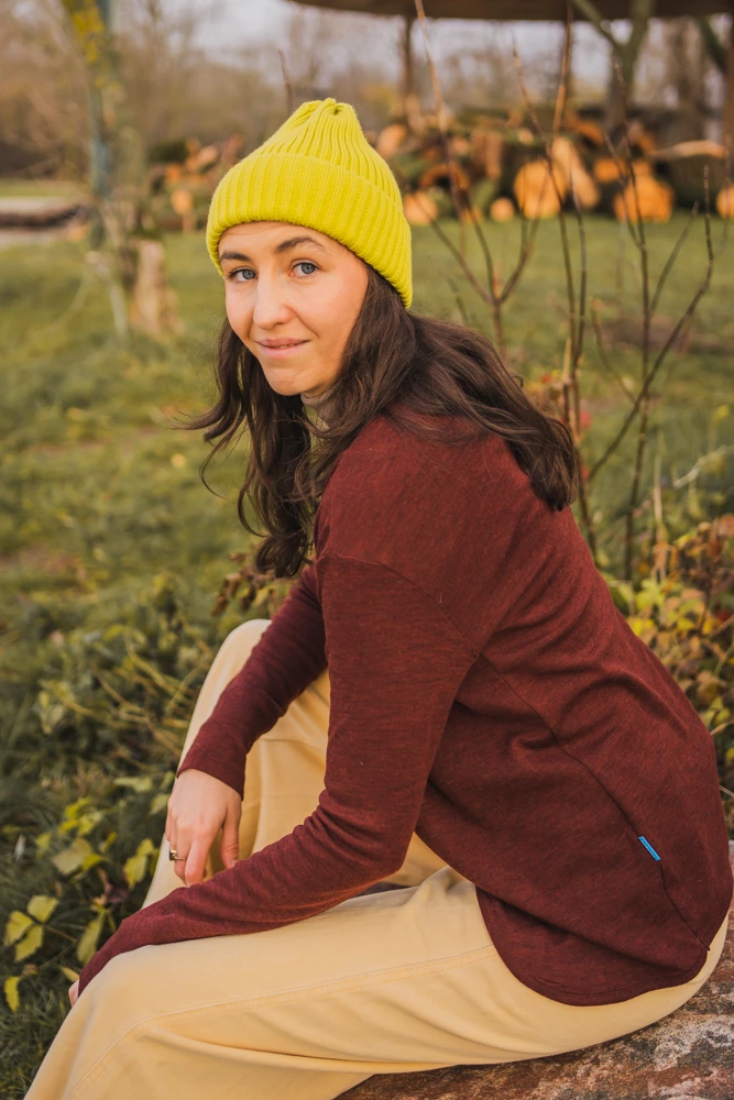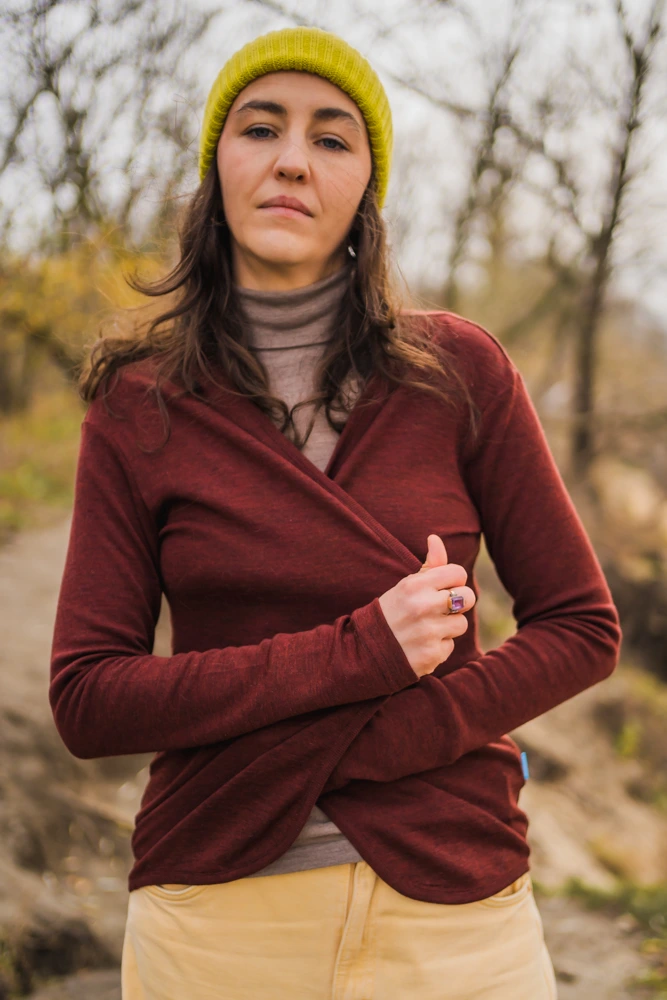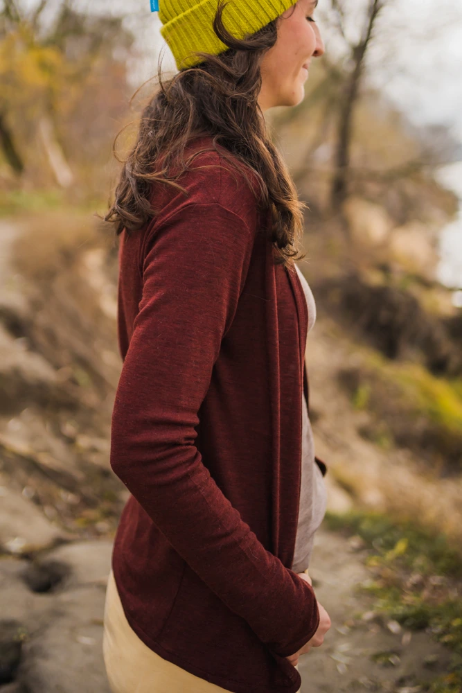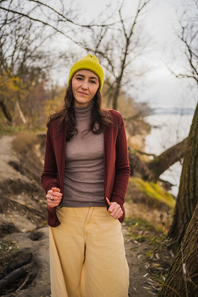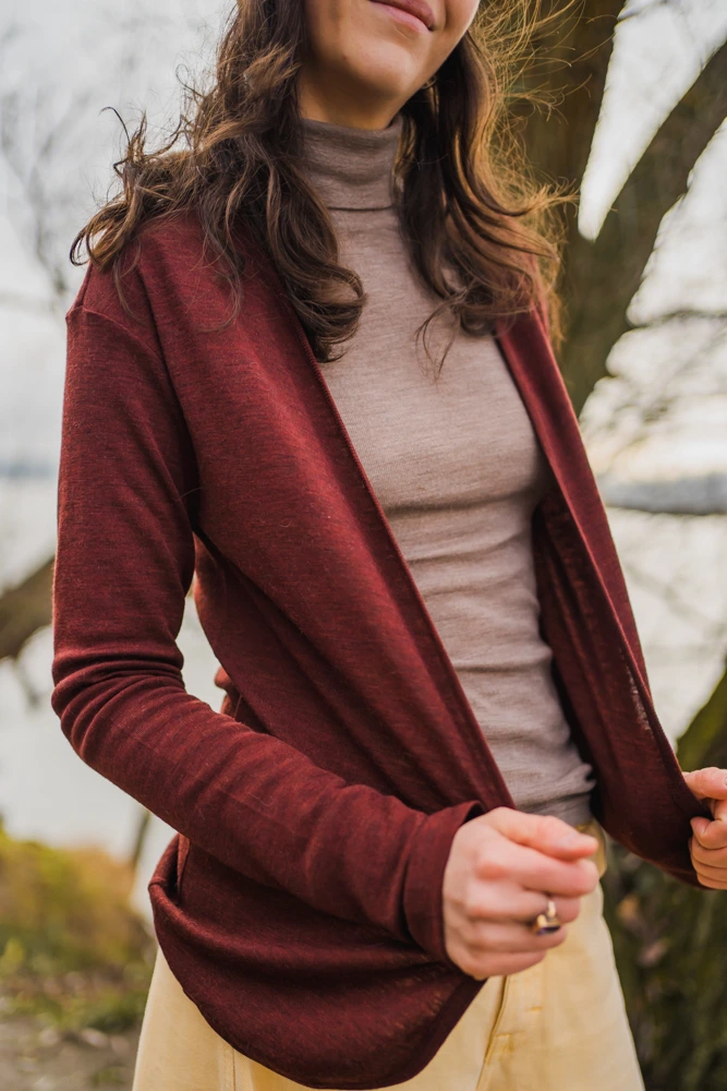 Cienki kardigan z wełny merino w bordowym melanżowym kolorze to całoroczny must have. Lekki, cienki, będziesz chciała mieć go zawsze przy sobie – bez względu na to, czy czas będziesz spędzać w domu czy na zewnątrz. To taki ubraniowy „PRZYDAŚ” – pod marynarkę, ramoneskę, wszędzie tam gdzie potrzebujesz dodatkowego dogrzania.