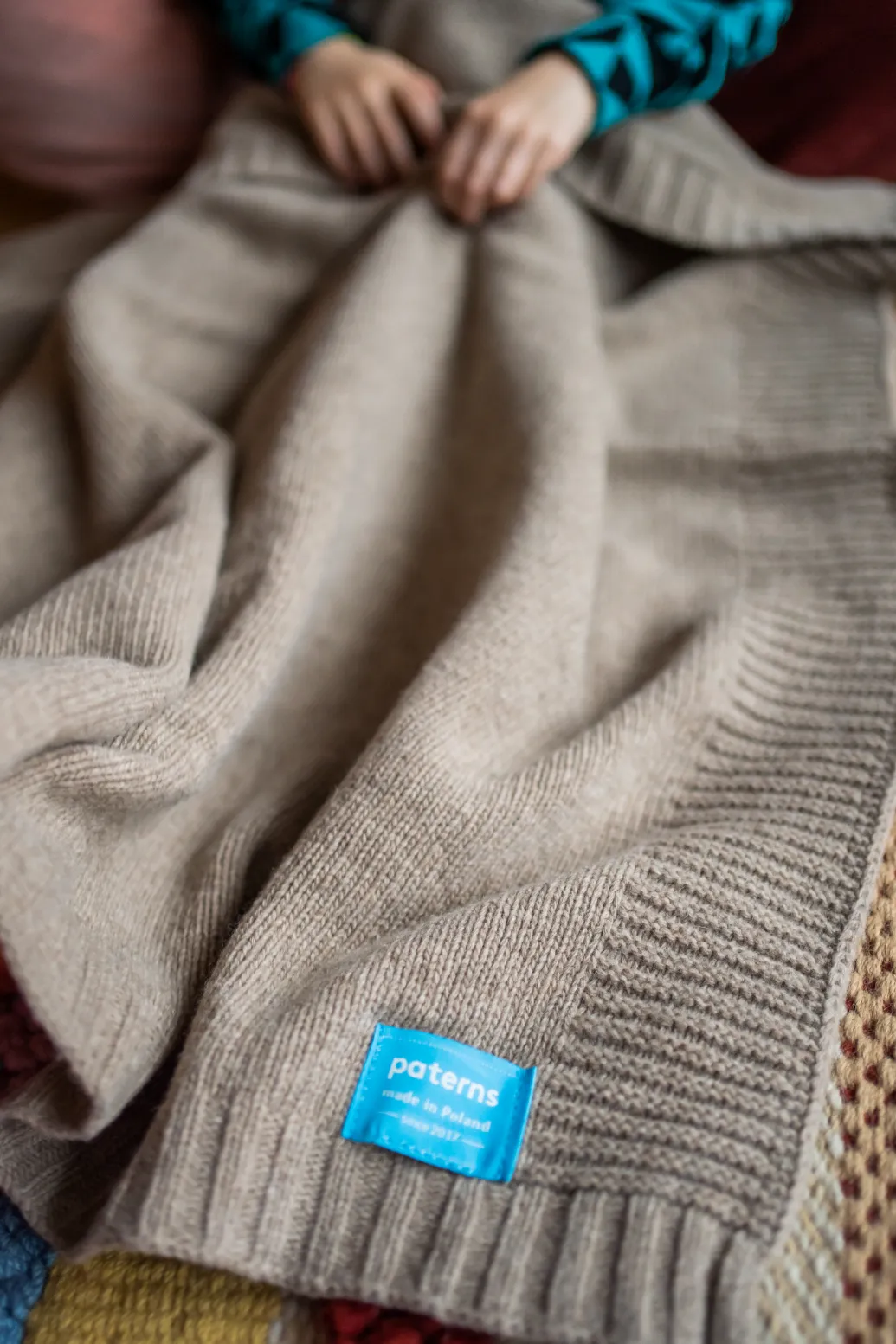 Kocyk z wełny merino 100% dla niemowlaka beżowy melanż Kocyk z wełny merino 100% dla niemowlaka szary Kocyk z wełny merino 100% dla niemowlaka zielony Kocyk z wełny merino 100% dla niemowlaka w czarno turkusowe trójkąty