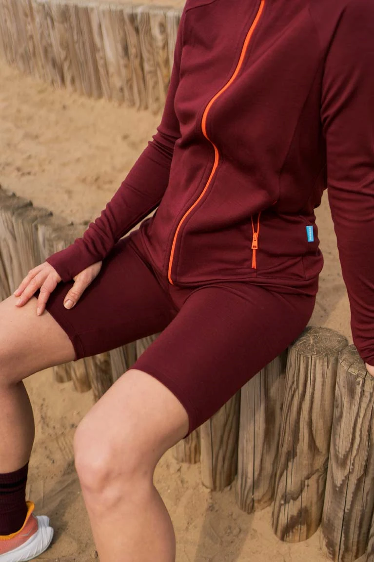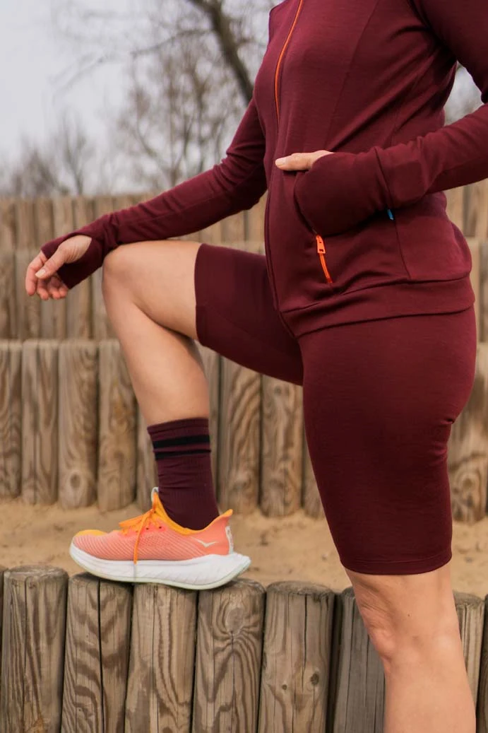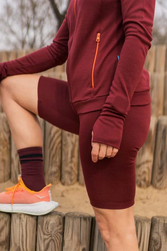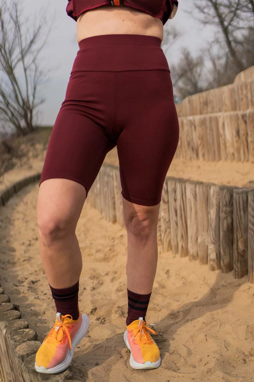 Kolarki z wełny merino w kolorze bordowym z wysokim stanem. Bardzo wygodne, nieuciskające. Wspaniale sprawdzają się podczas uprawiania sportu.