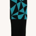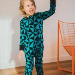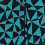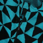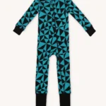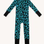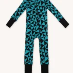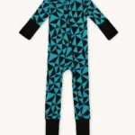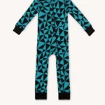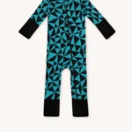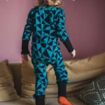 Rampers dziecięcy z wełny merino we wzór w turkusowo-czarne trójkąty. Zapinanie na ukośny suwak sprawia, że szybko i łatwo go założysz i zdejmiesz. Ma wywijane mankiety na nogawkach i rękawach, dzięki czemu starczy na dłużej i będzie rósł razem z dzieckiem! Jest dopasowany i elastyczny. Idealny pod kombinezon i do noszenia solo.