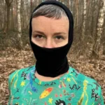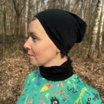 Czarna chusta wielofunkcyjna uszyta z najdelikatniejszej dzianiny z wełny merino. Chusta ma wiele zastosowań, może być czapką, kominiarką, kominem, opaską na głowę lub rękę. Wygodnie mieści się pod kaskiem rowerowym i narciarskim.
