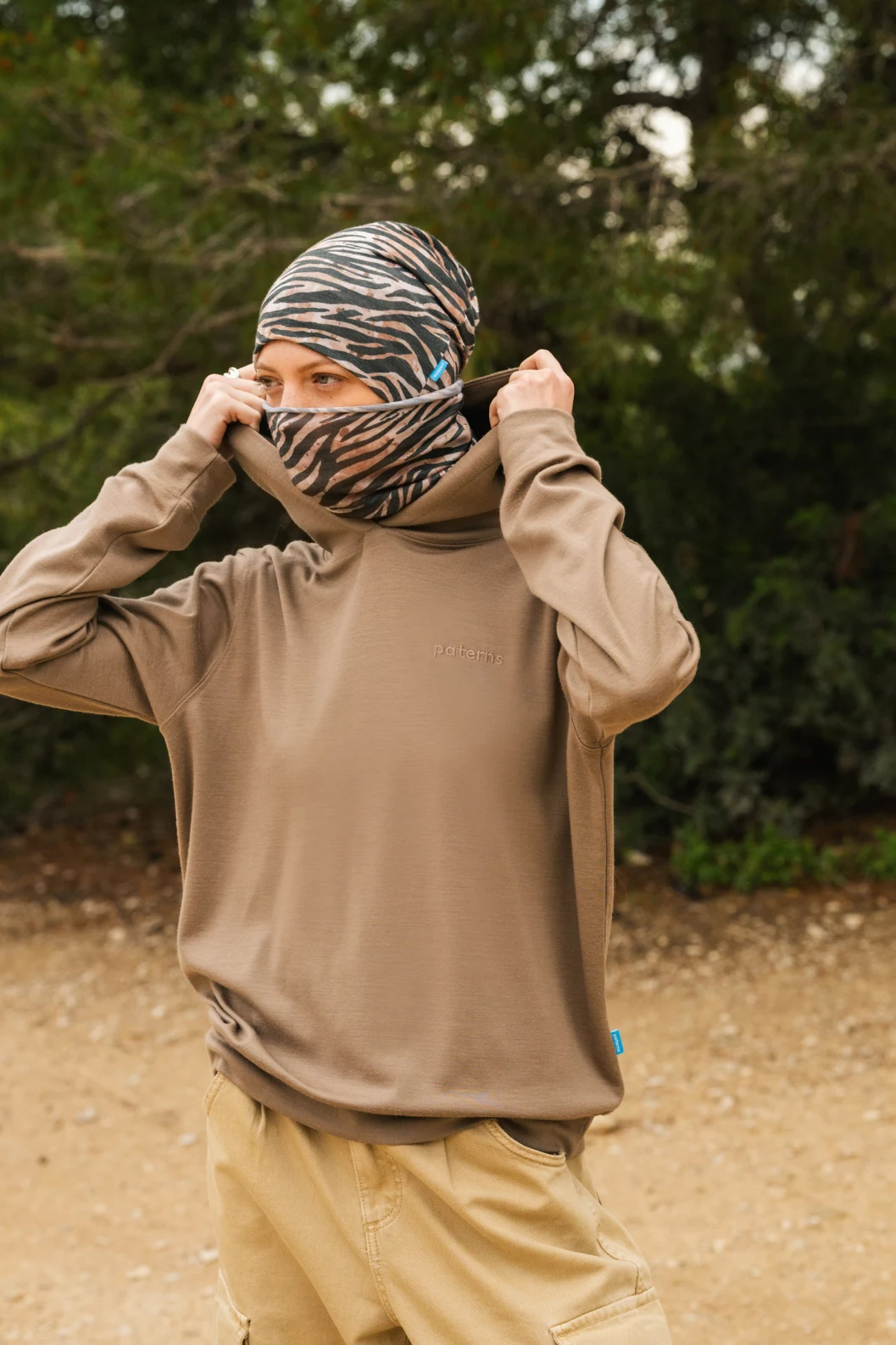 Chusta wielofunkcyjna uszyta z bardzo delikatnej i miękkiej dzianiny z wełny merino, wzór w zebrę. Chustę możesz nosić na wiele sposobów. Jako czapkę, kominiarkę, komin, opaskę na głowę lub rękę. Mieści się bez problemu pod kaskiem rowerowym i narciarskim.