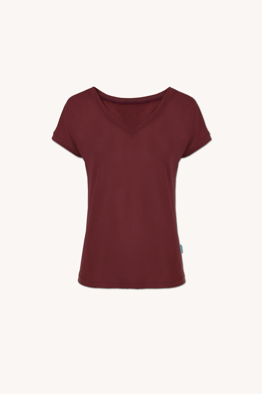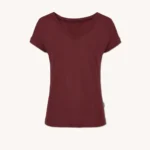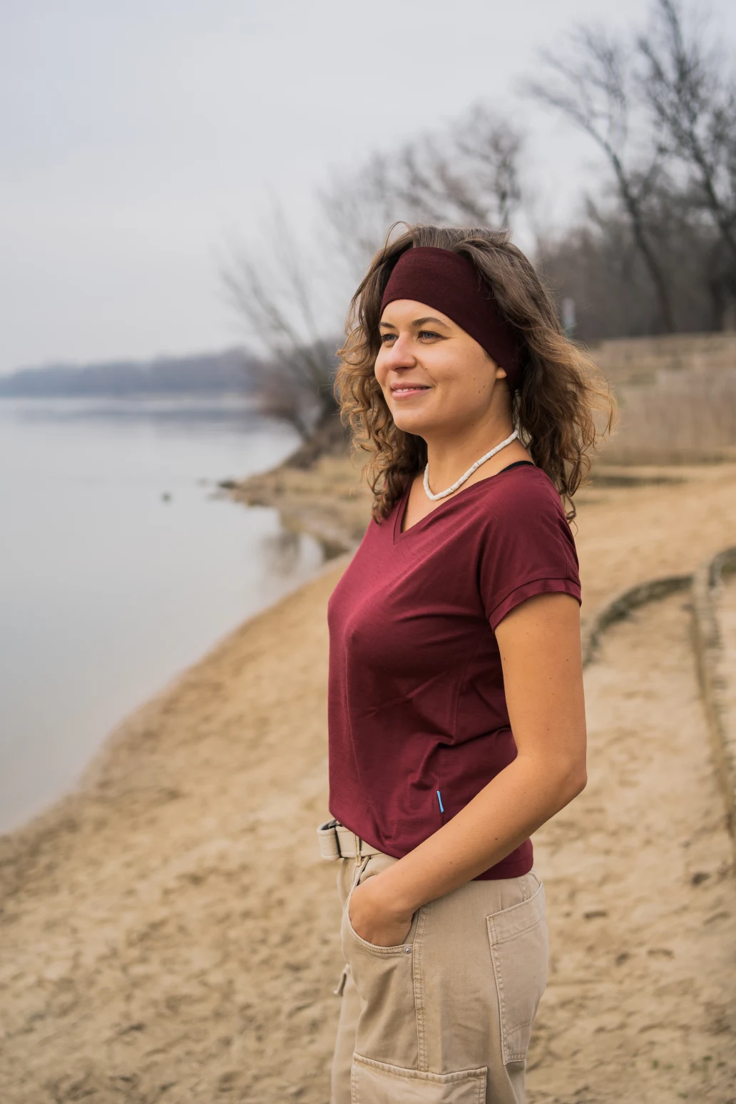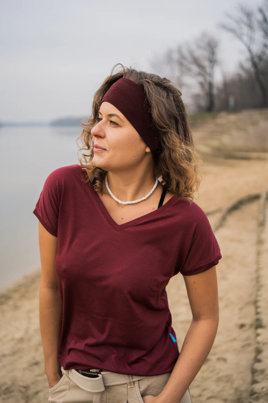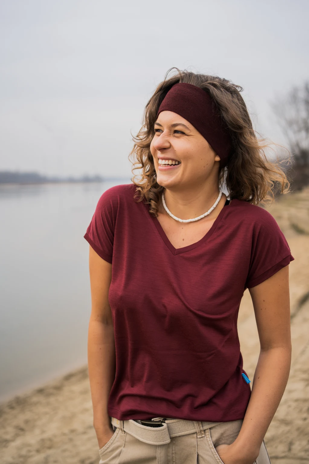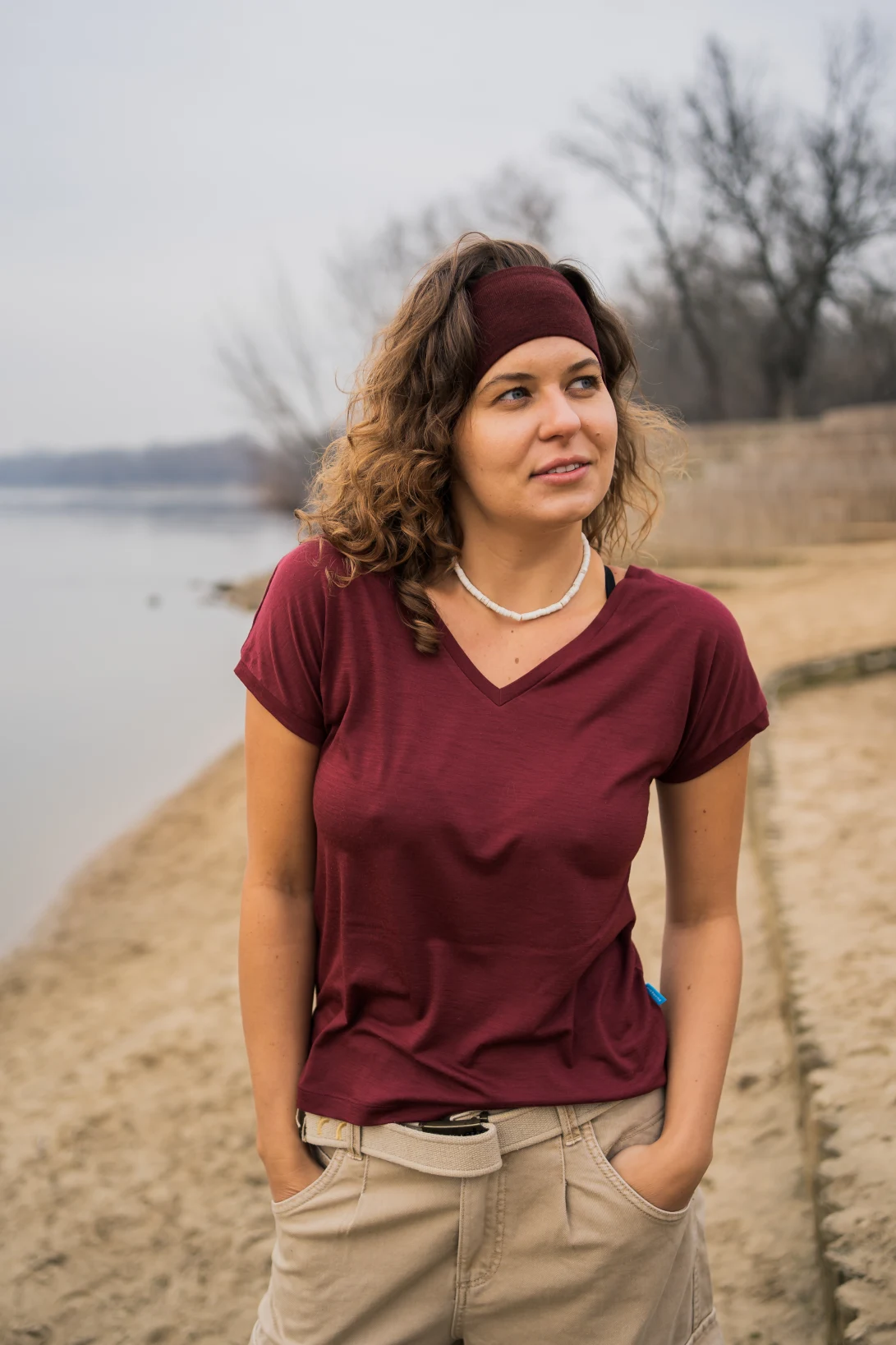T-shirt damski w kolorze bordowym z dekoltem V. Wykonany w 100% z miękkiej i cienkiej wełny merino.