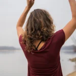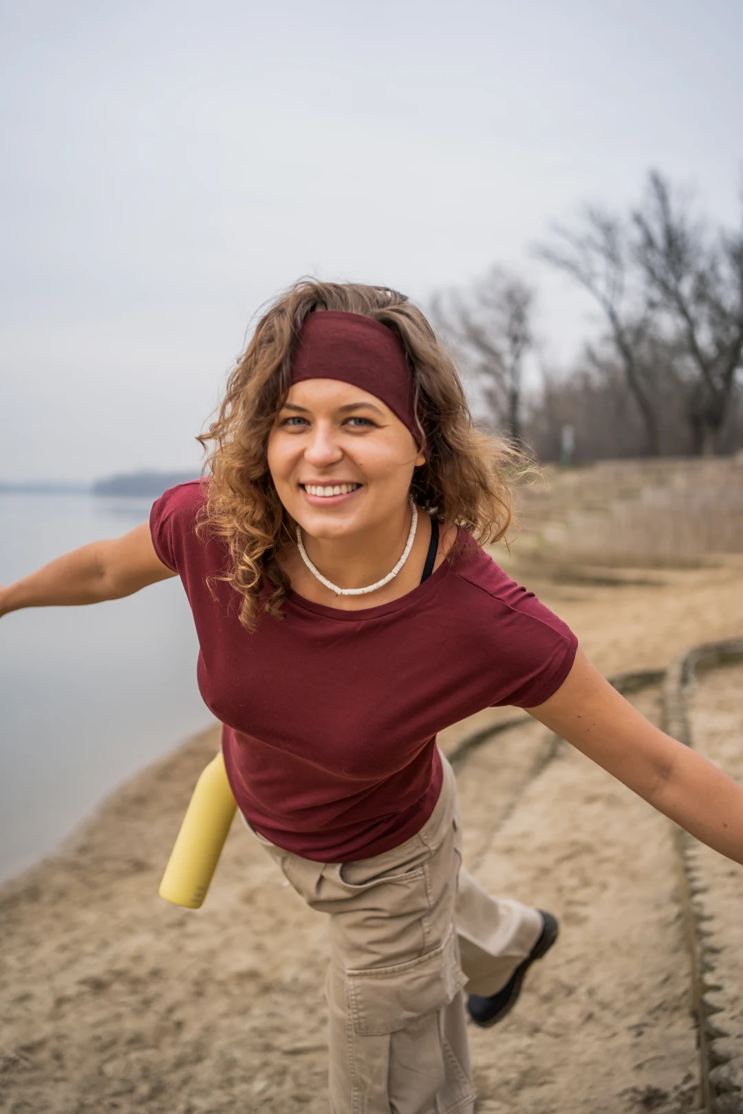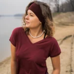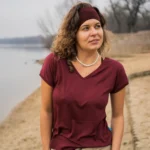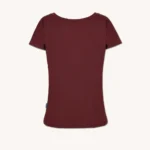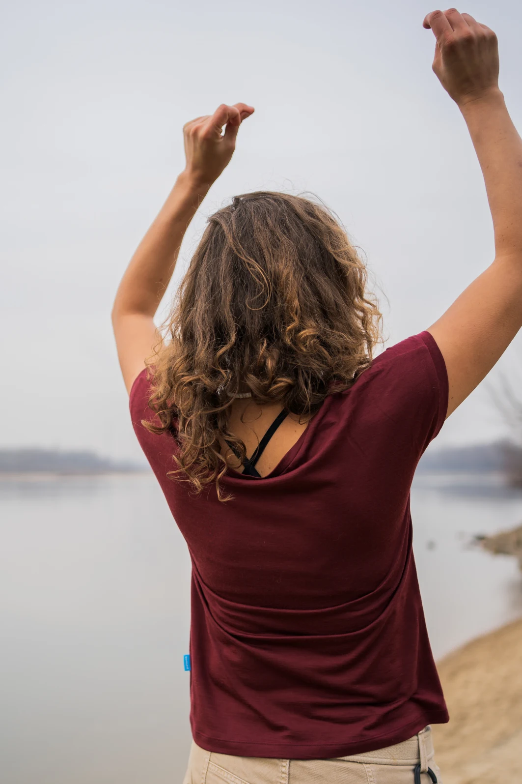 DEKOLT Z PRZODU LUB NA PLECACH – bordowy t-shirt z wełny merino ma metkę wszytą z boku, więc możesz nosić go na dwa sposoby: z dekoltem V z przodu albo z tyłu – wtedy przód jest zabudowany. Dekolt nie jest bardzo głęboki, więc nie musisz obawiać się, że nosząc go z tyłu, będzie wystawało zapięcie od stanika. Bez względu na to, jak go założysz, t-shirt będzie się ładnie układał.