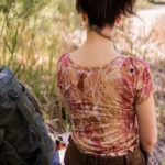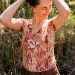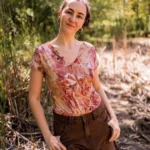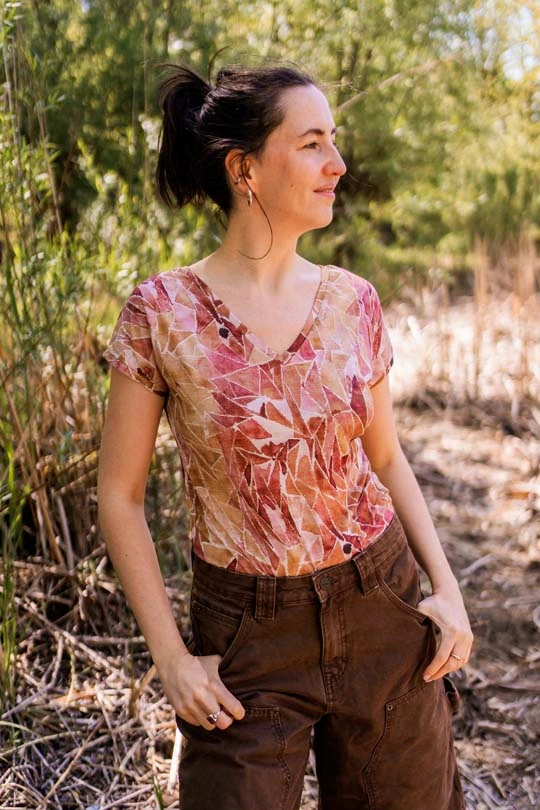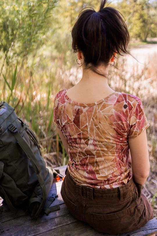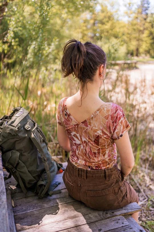 DEKOLT Z PRZODU LUB NA PLECACH – t-shirt z wełny merino ma metkę wszytą z boku, więc możesz nosić go na dwa sposoby: z dekoltem V z przodu albo z tyłu – wtedy przód jest zabudowany. Dekolt nie jest bardzo głęboki, więc nie musisz obawiać się, że nosząc go z tyłu, będzie wystawało zapięcie od stanika. Bez względu na to, jak go założysz, t-shirt będzie się ładnie układał.