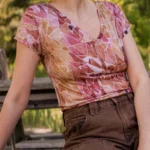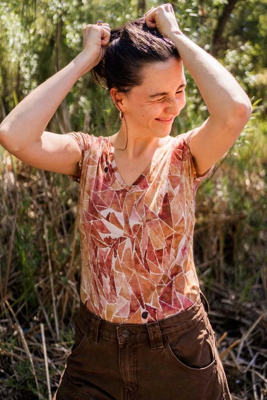 T-shirt damski we wzorze ginger gorpcore z dekoltem V. Wykonany w 100% z miękkiej i cienkiej wełny merino.
