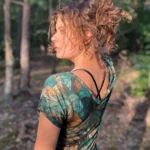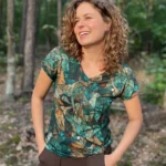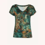 T-shirt damski we wzorze green gorpcore z dekoltem V. Wykonany w 100% z miękkiej i cienkiej wełny merino.