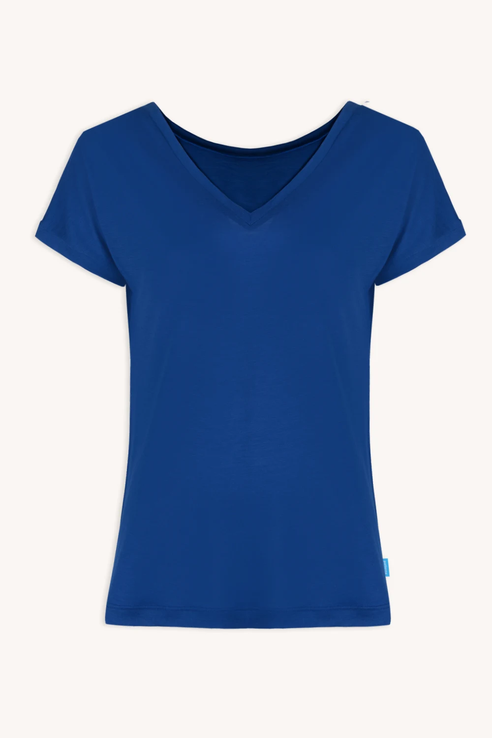 T-shirt damski w kolorze kobaltowym z dekoltem V. Wykonany w 100% z miękkiej i cienkiej wełny merino.