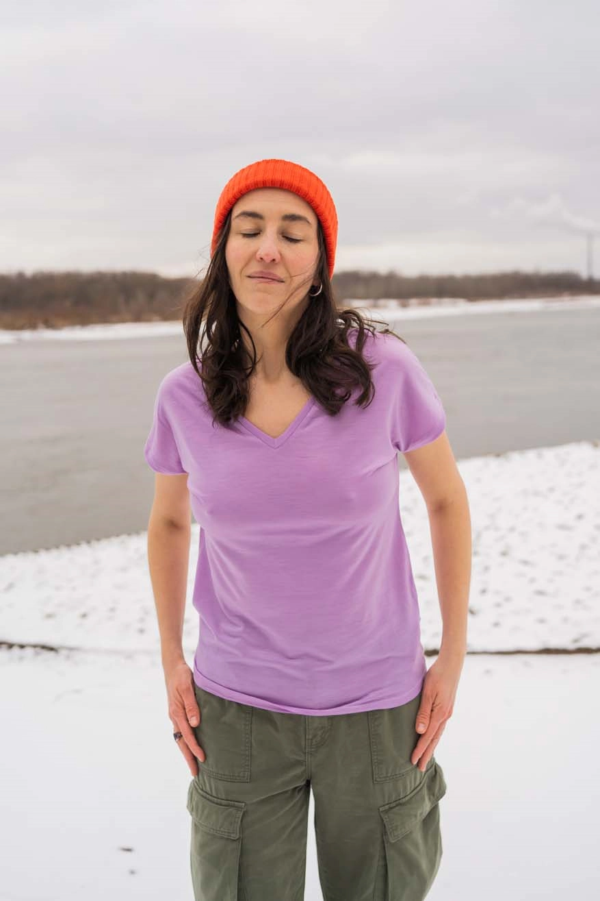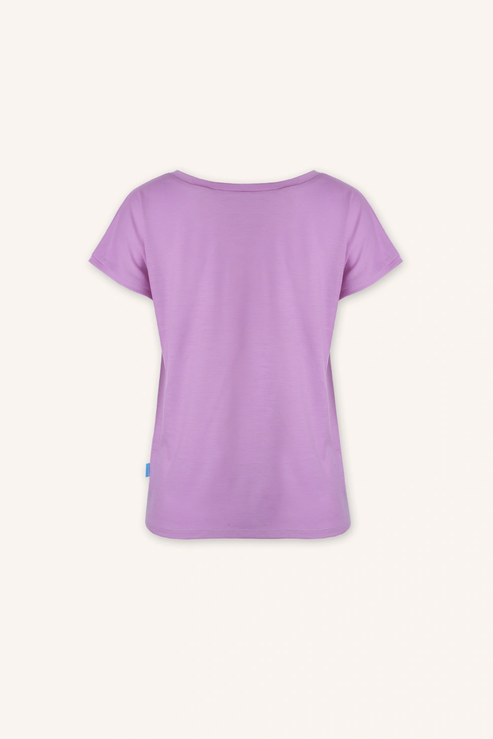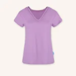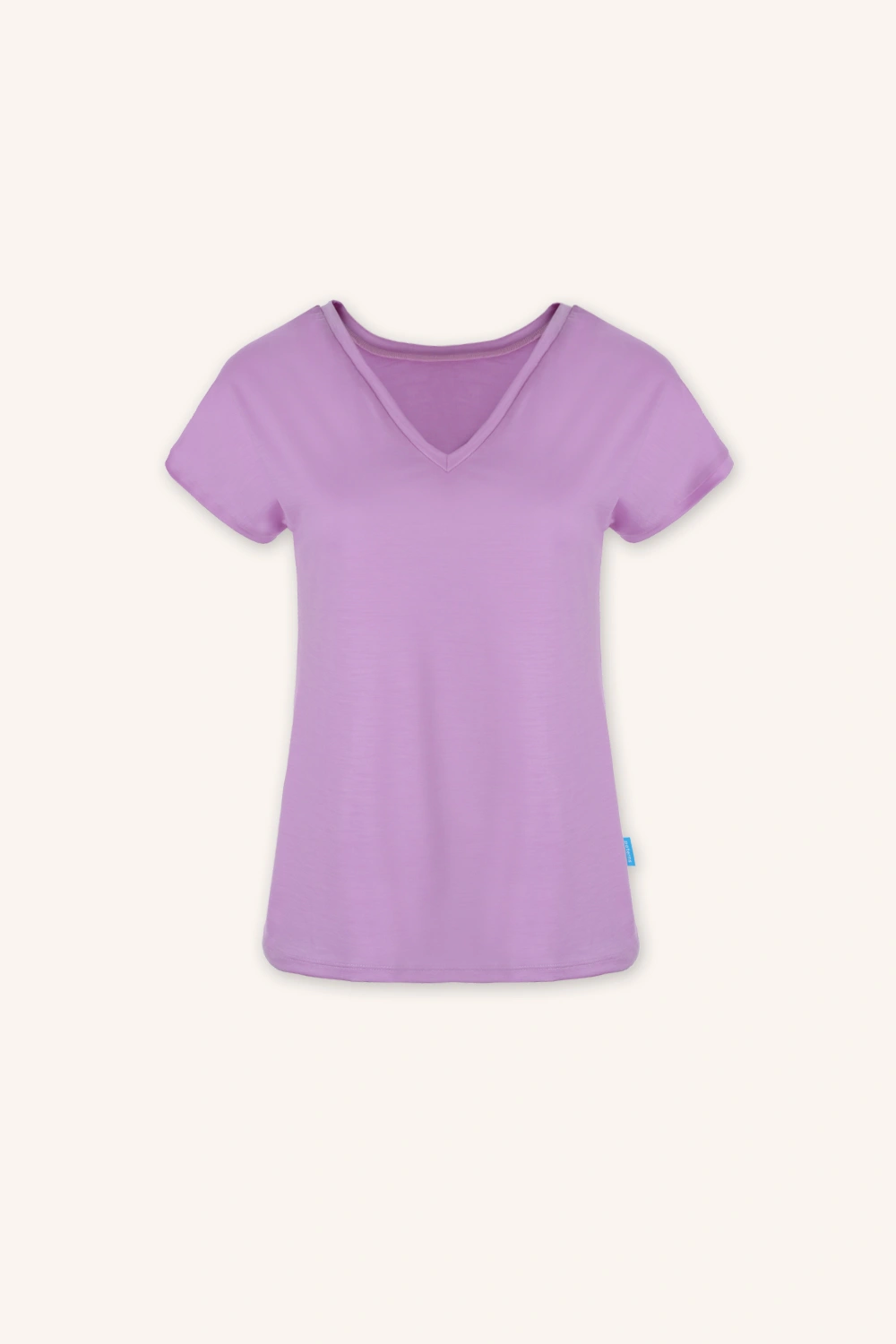 T-shirt damski w kolorze liliowym z dekoltem V. Wykonany w 100% z miękkiej i cienkiej wełny merino.