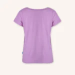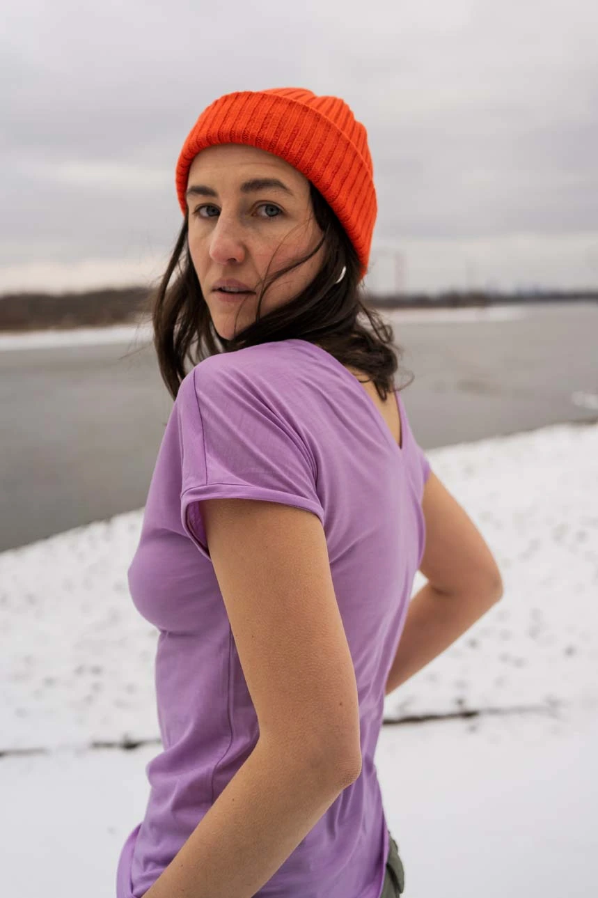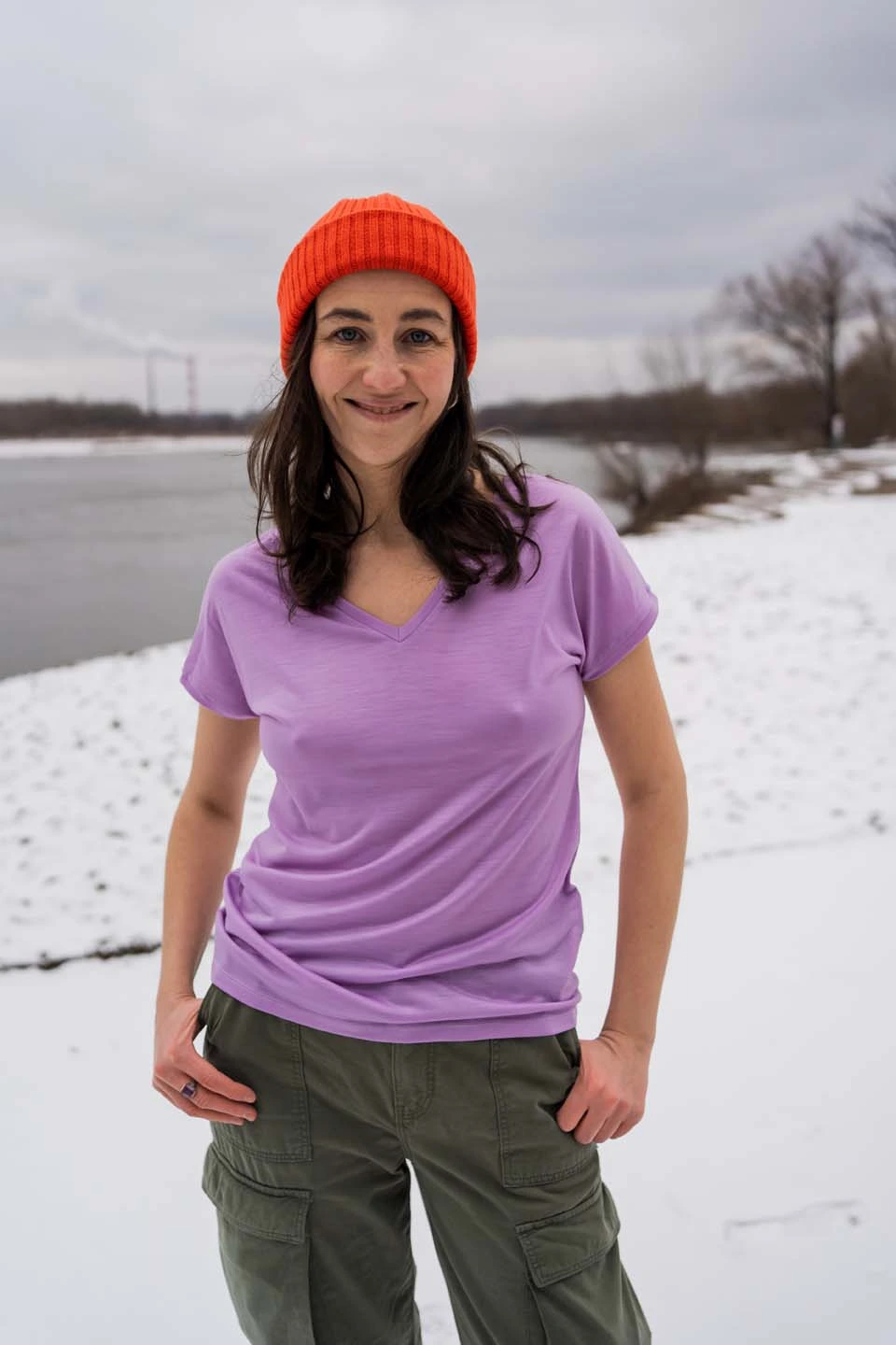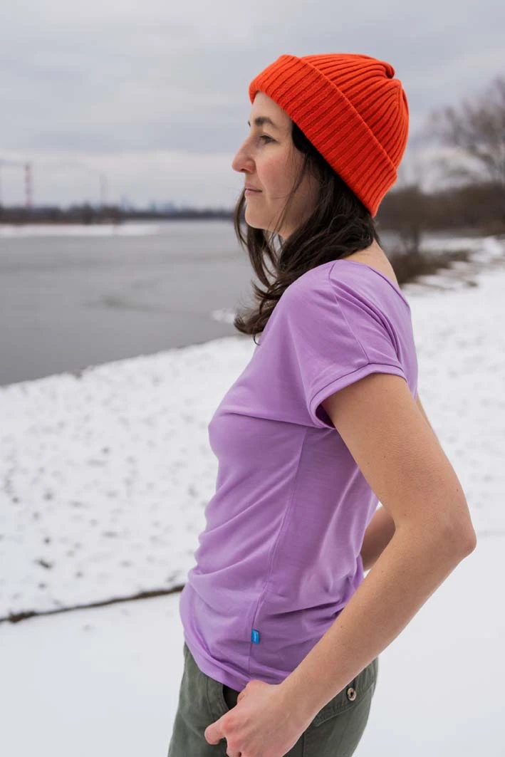 T-shirt damski w kolorze liliowym z dekoltem V. Wykonany w 100% z miękkiej i cienkiej wełny merino.