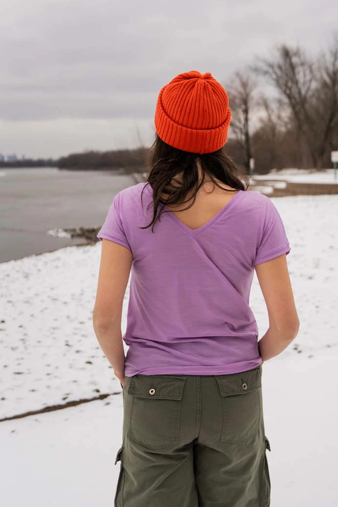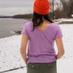 DEKOLT Z PRZODU LUB NA PLECACH – t-shirt z wełny merino ma metkę wszytą z boku, więc możesz nosić go na dwa sposoby: z dekoltem V z przodu albo z tyłu – wtedy przód jest zabudowany. Dekolt nie jest bardzo głęboki, więc nie musisz obawiać się, że nosząc go z tyłu, będzie wystawało zapięcie od stanika. Bez względu na to, jak go założysz, t-shirt będzie się ładnie układał.
