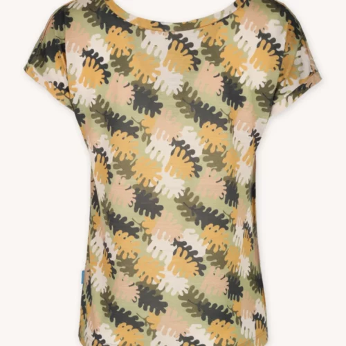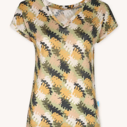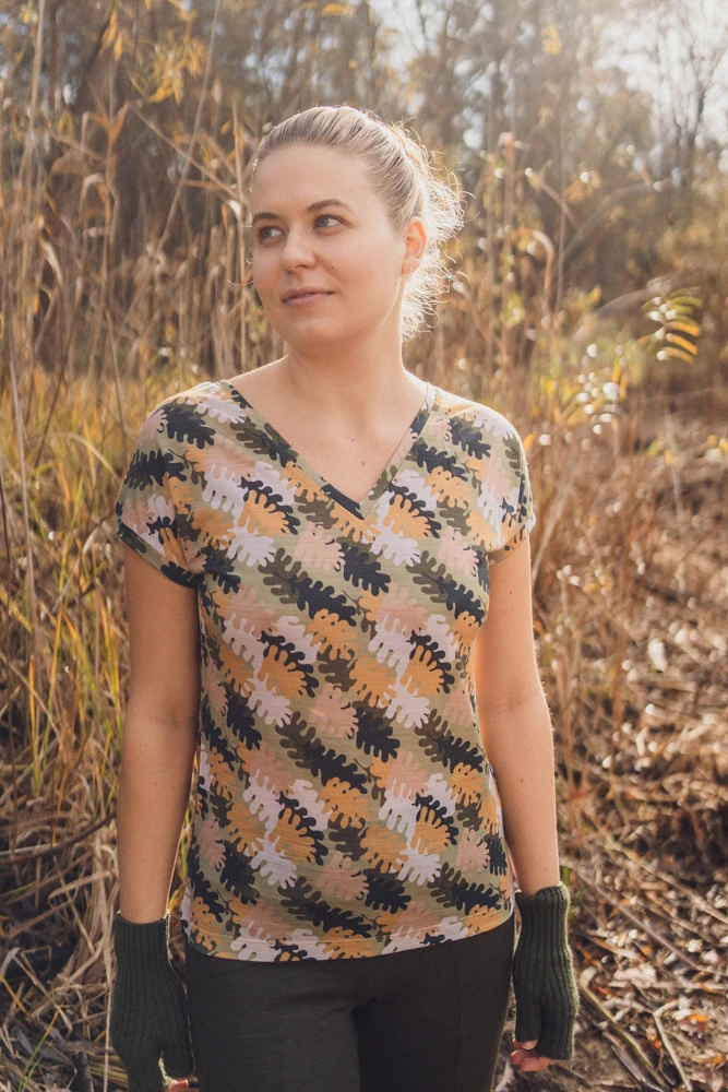 T-shirt damski we wzór w liście dębu z dekoltem V. Wykonany w 100% z miękkiej i cienkiej wełny merino.