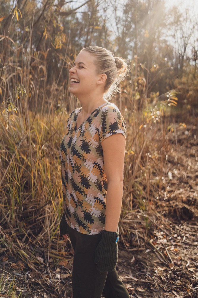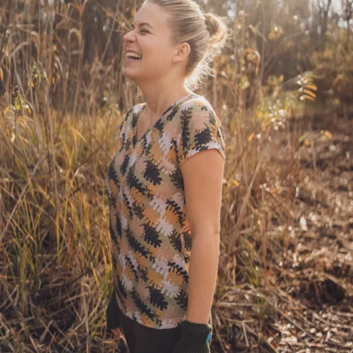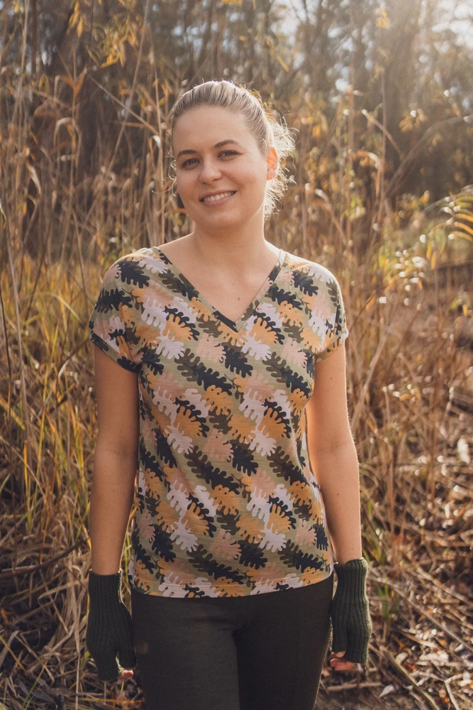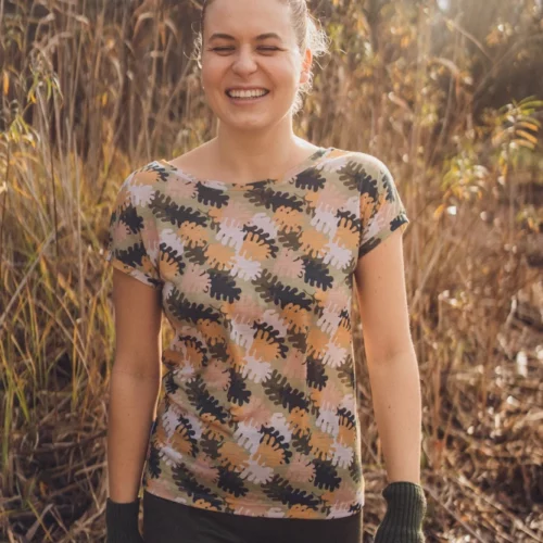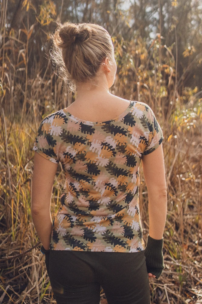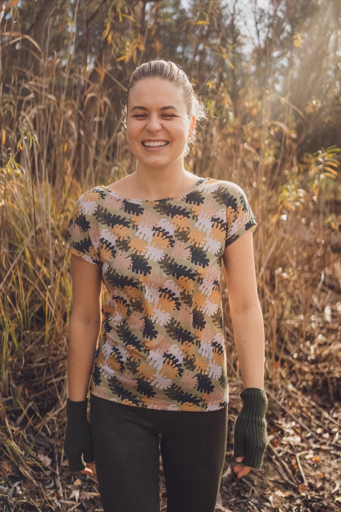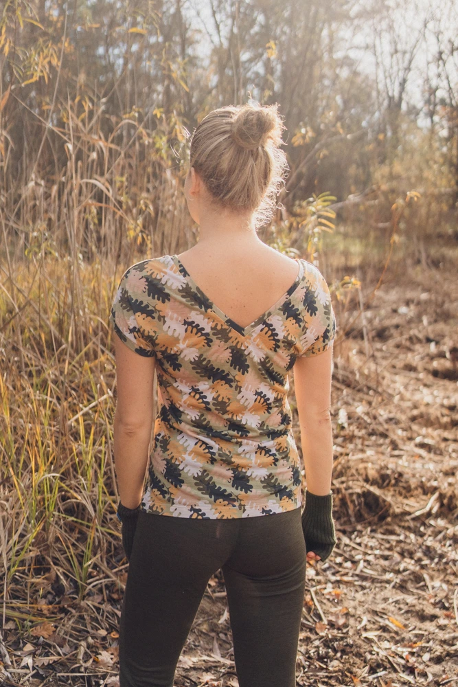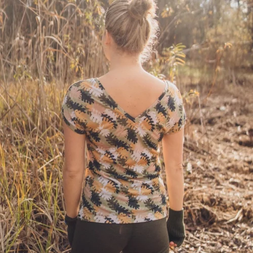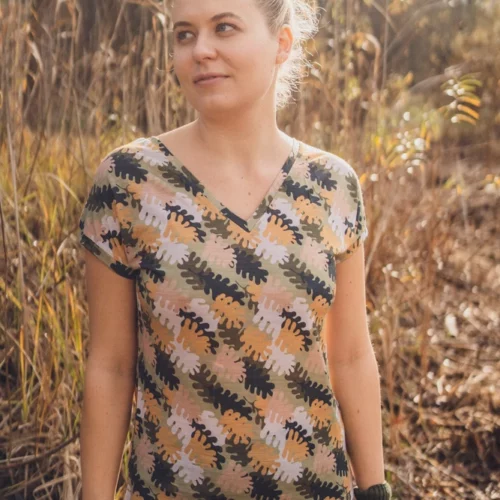DEKOLT Z PRZODU LUB NA PLECACH – wzorzysty t-shirt z wełny merino ma metkę wszytą z boku, więc możesz nosić go na dwa sposoby: z dekoltem V z przodu albo z tyłu – wtedy przód jest zabudowany. Dekolt nie jest bardzo głęboki, więc nie musisz obawiać się, że nosząc go z tyłu, będzie wystawało zapięcie od stanika. Bez względu na to, jak go założysz, t-shirt będzie się ładnie układał.