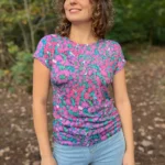 DEKOLT Z PRZODU LUB NA PLECACH – t-shirt z wełny merino ma metkę wszytą z boku, więc możesz nosić go na dwa sposoby: z dekoltem V z przodu albo z tyłu – wtedy przód jest zabudowany. Dekolt nie jest bardzo głęboki, więc nie musisz obawiać się, że nosząc go z tyłu, będzie wystawało zapięcie od stanika. Bez względu na to, jak go założysz, t-shirt będzie się ładnie układał.