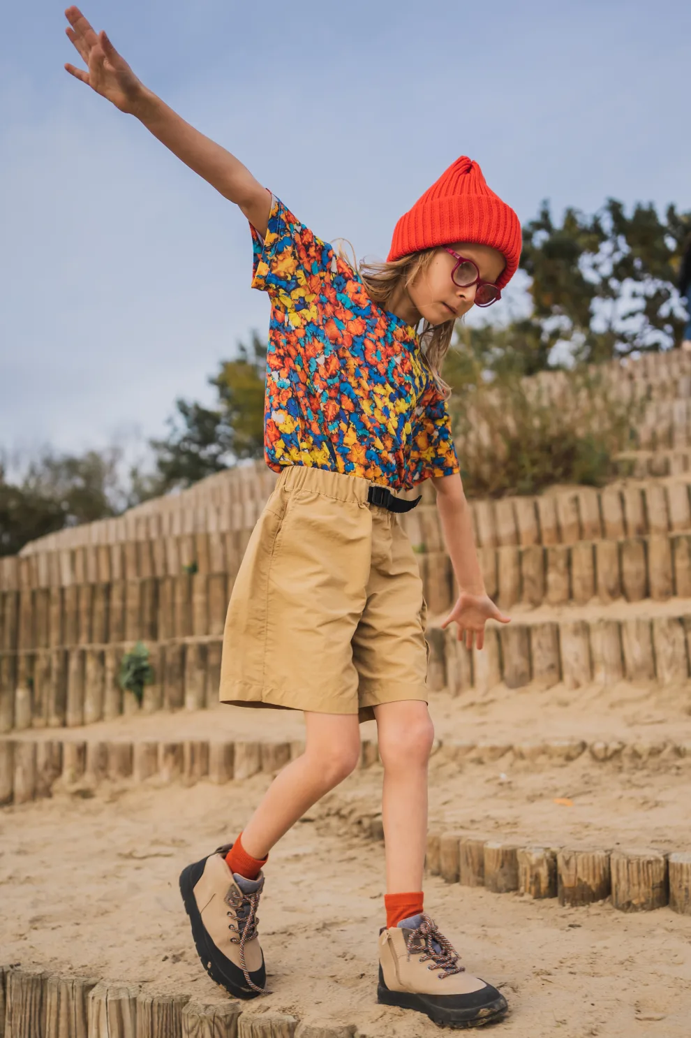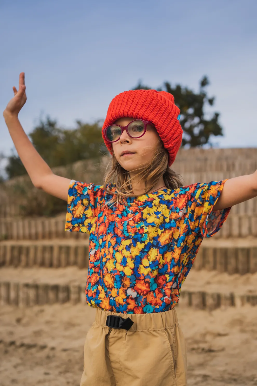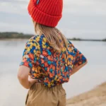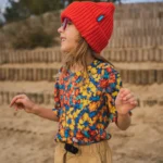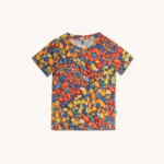Kolorowy t-shirt z wełny merino we wzór w motylki dla dziecka z kieszonką na skarby.