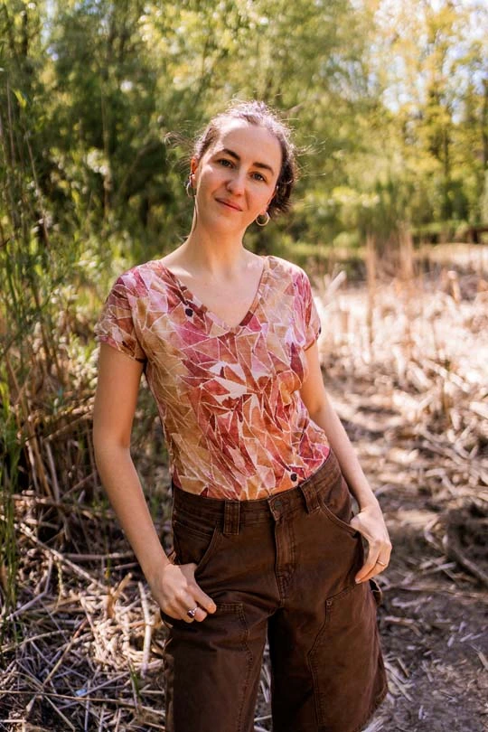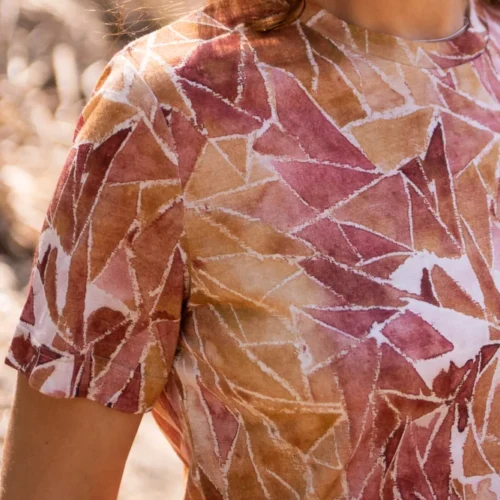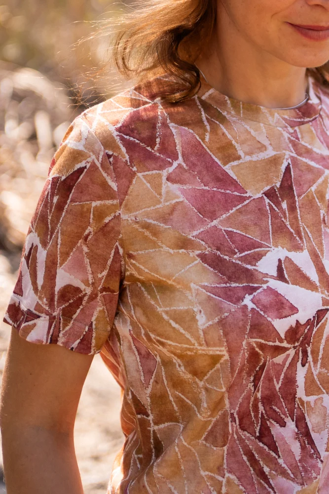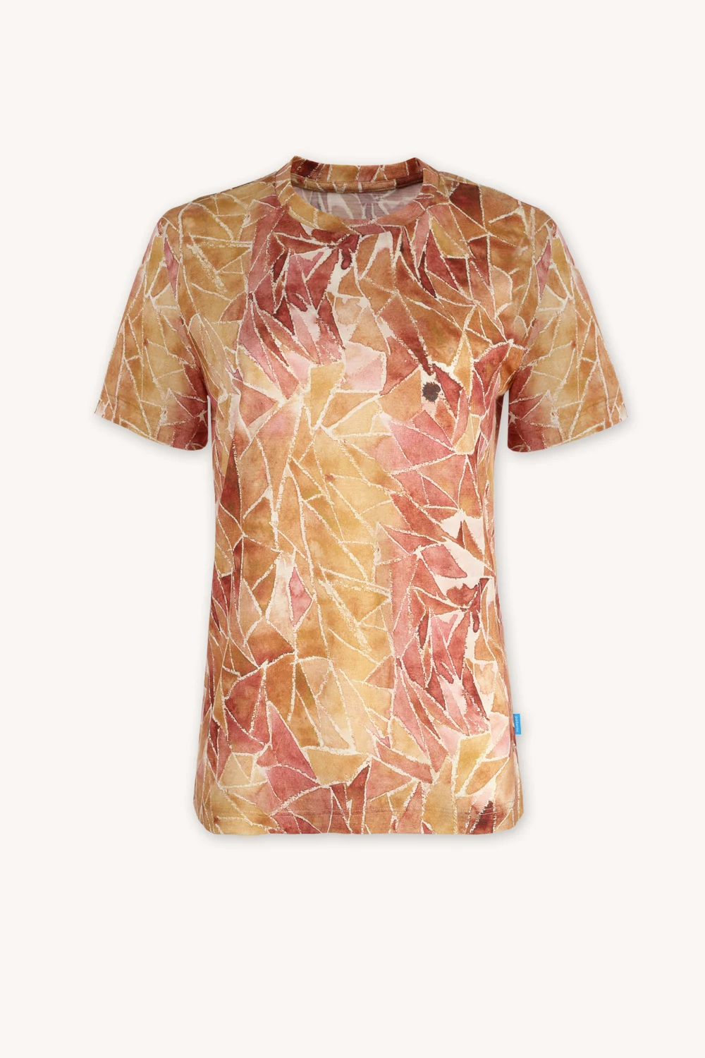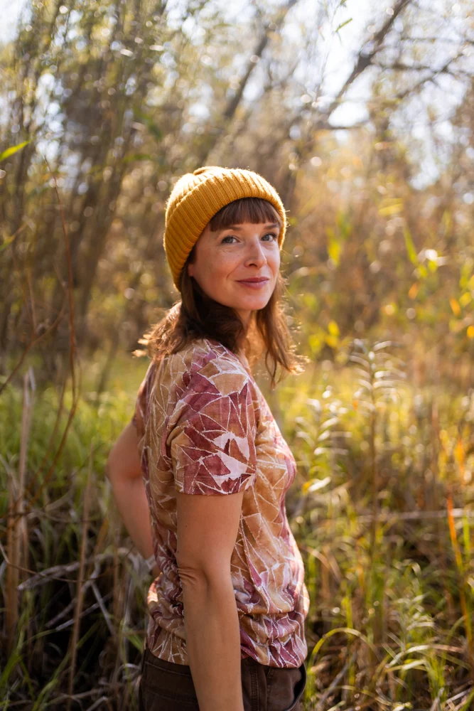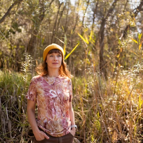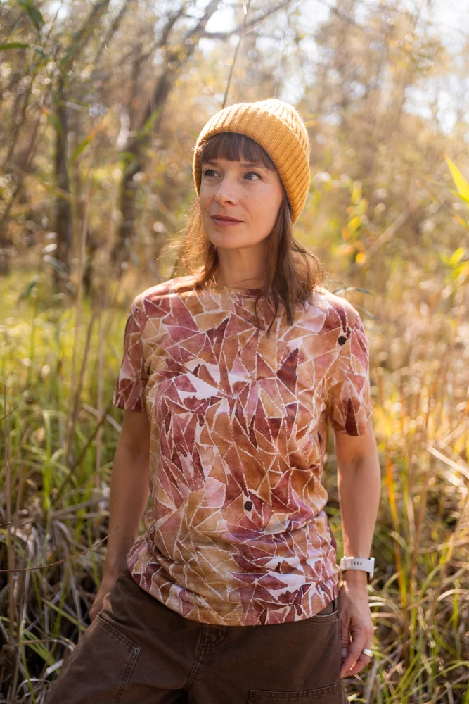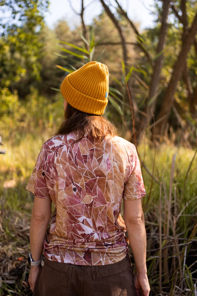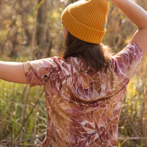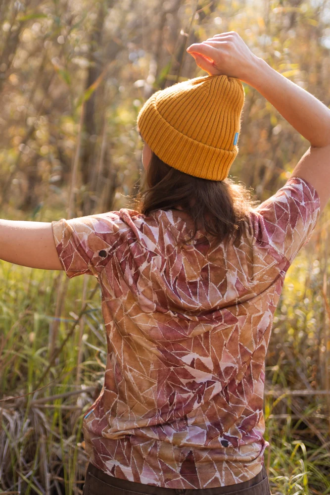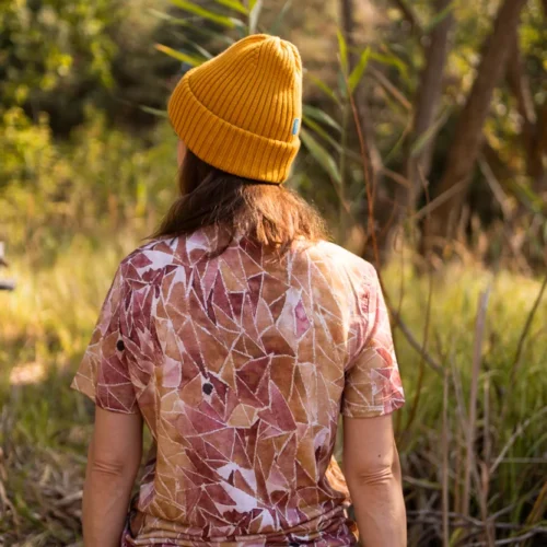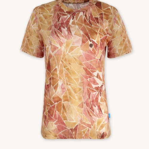 T-shirt damski we wzór ginger gorpcore typu o-neck. Idealna koszulka do uprawiania sportu. Wykonany w 100% z miękkiej i cienkiej wełny merino.