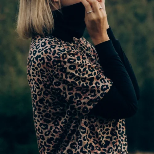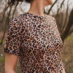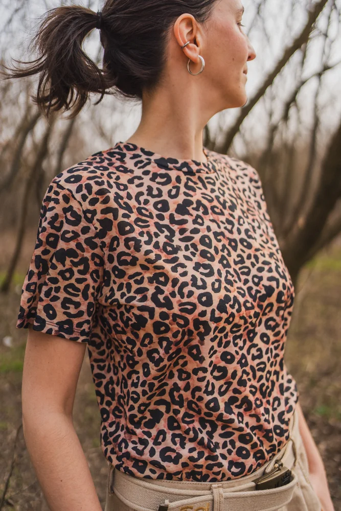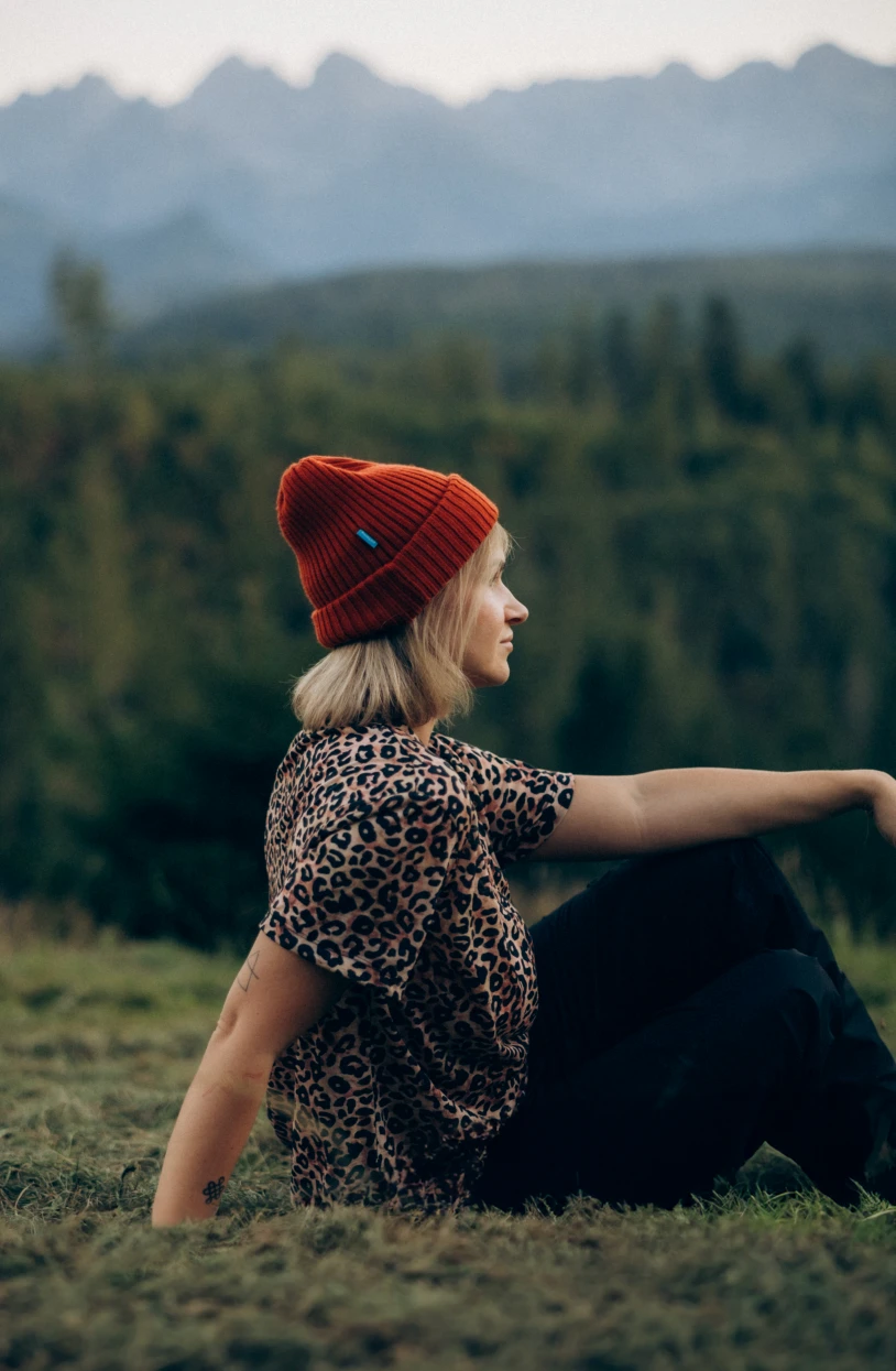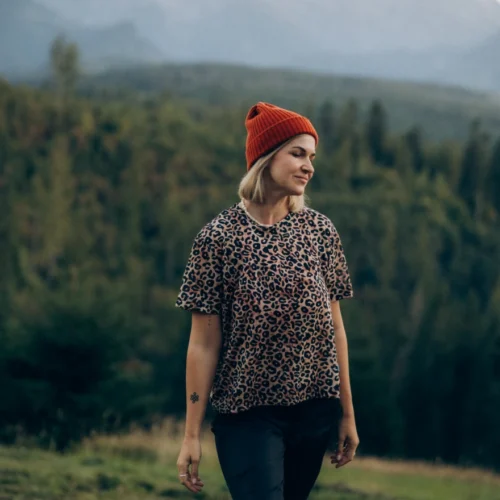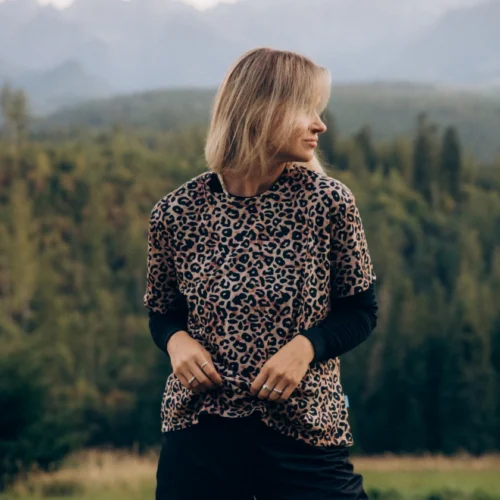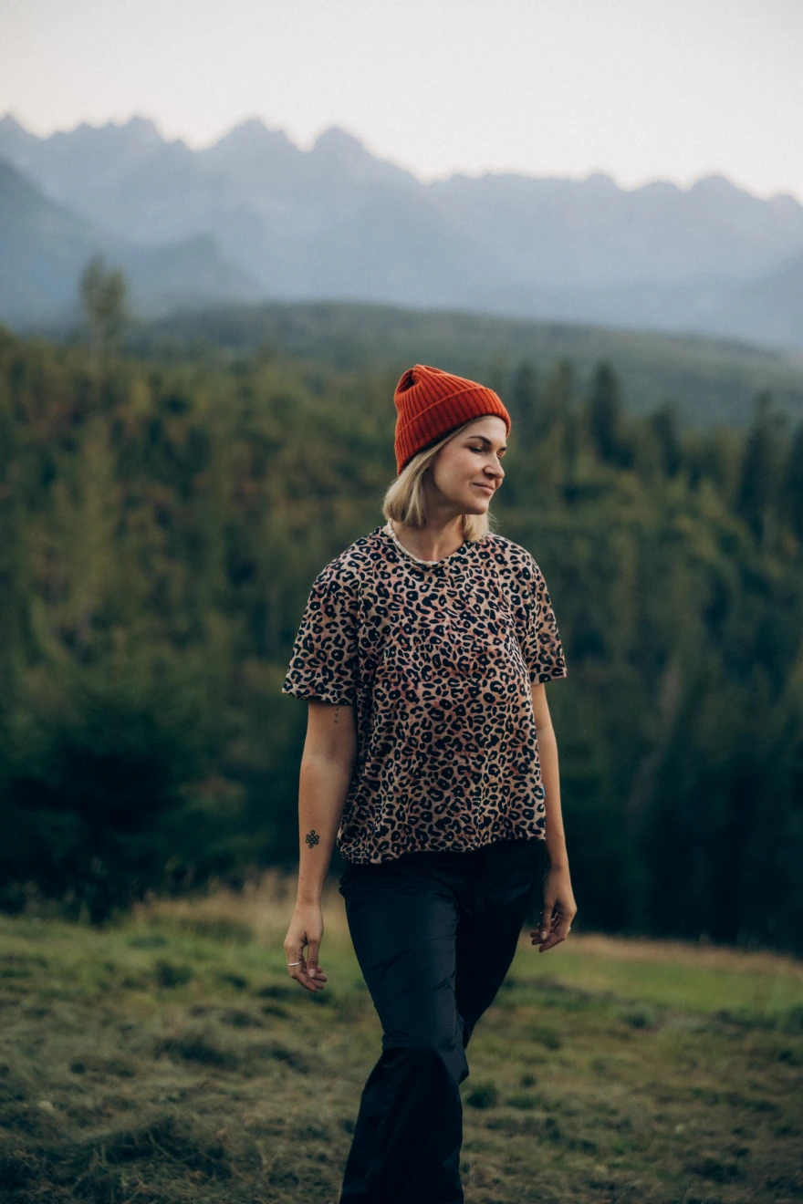 T-shirt damski w panterkę typu o-neck. Idealna koszulka do uprawiania sportu. Wykonany w 100% z miękkiej i cienkiej wełny merino.