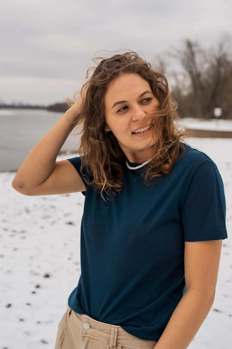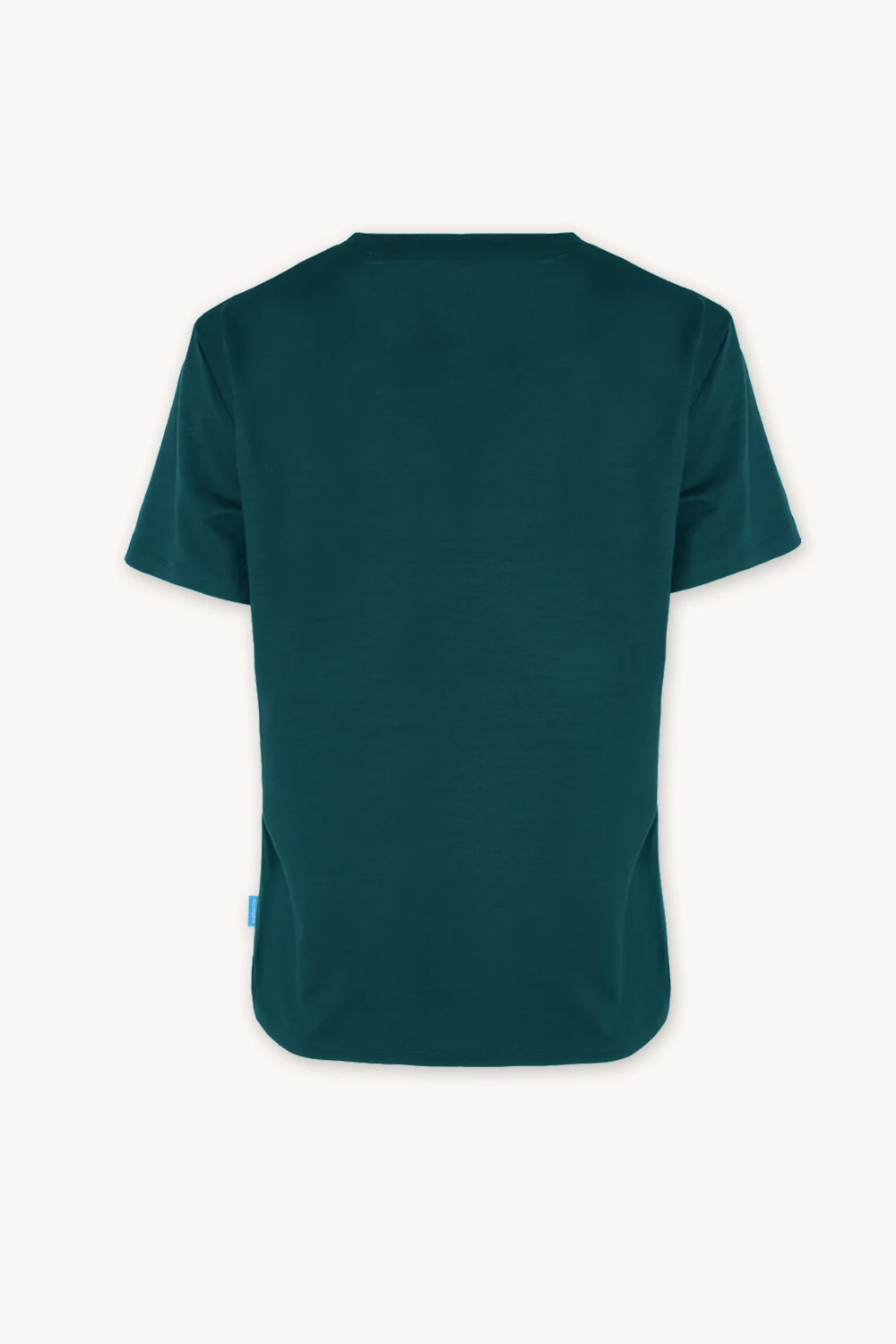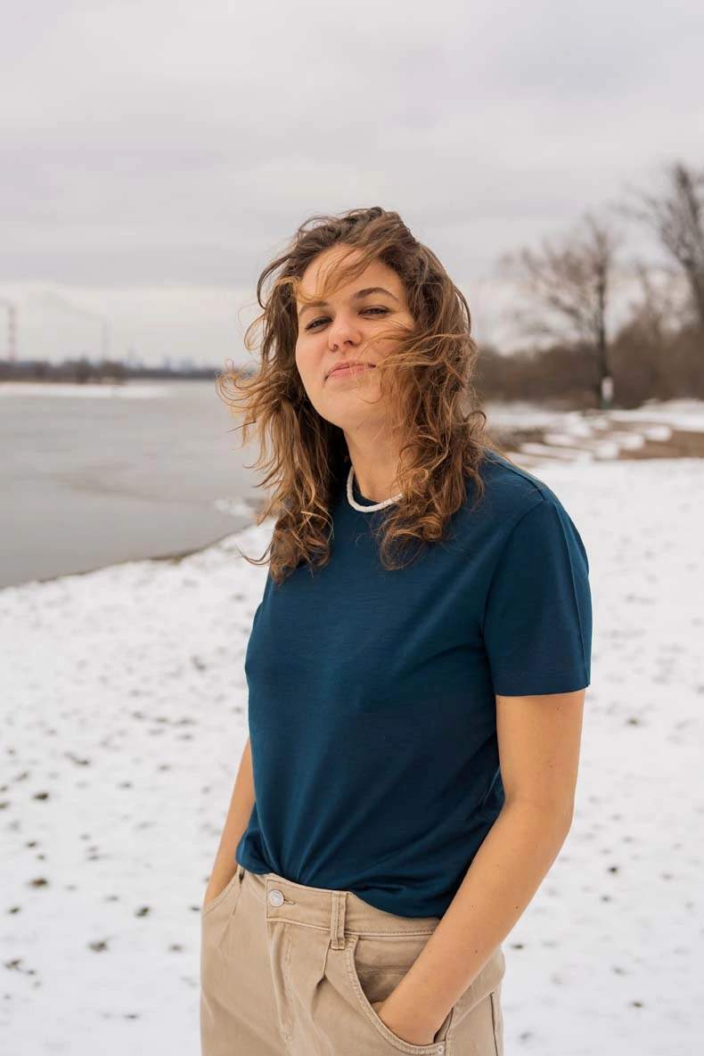 T-shirt damski w kolorze petrol typu o-neck. Idealna koszulka do uprawiania sportu. Wykonany w 100% z miękkiej i cienkiej wełny merino.