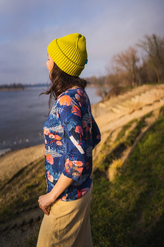 KRÓJ – Koszulka jest luźna (podobnie, jak nasz t-shirt z dekoltem V), ma dekolt w łódkę pięknie podkreśla obojczyki, a rękaw ¾ eksponuje nadgarstki. Jest na tyle długa, że bez problemu włożysz ją w spodnie, ale jednocześnie równie dobrze prezentuje się wyciągnięta na wierzch.