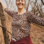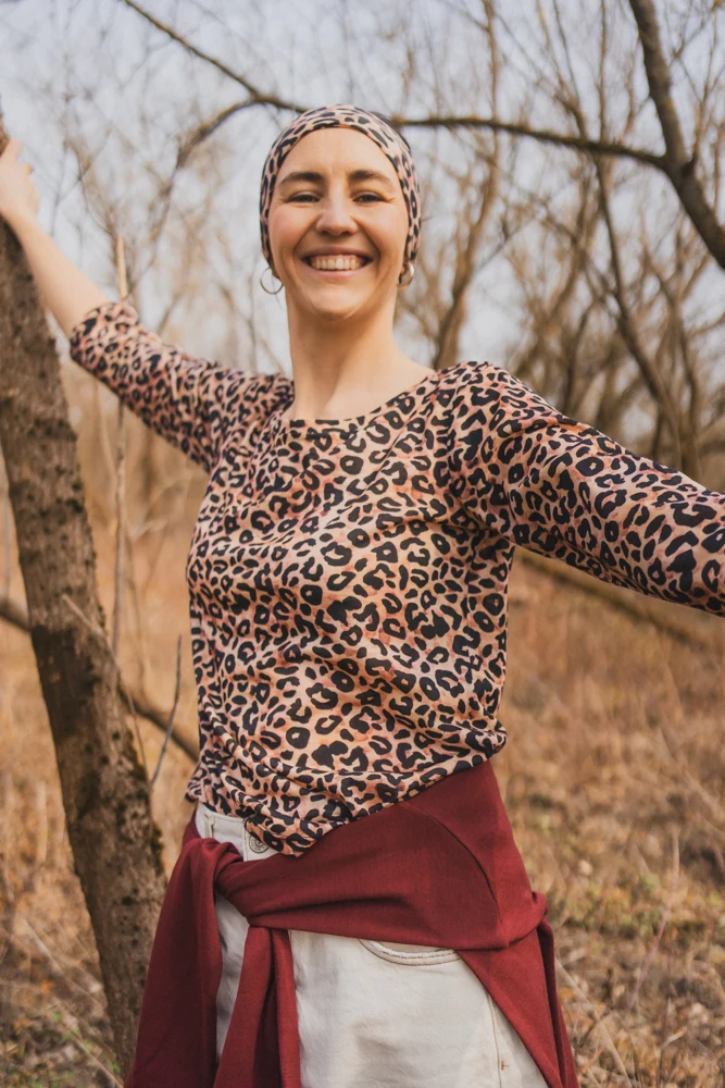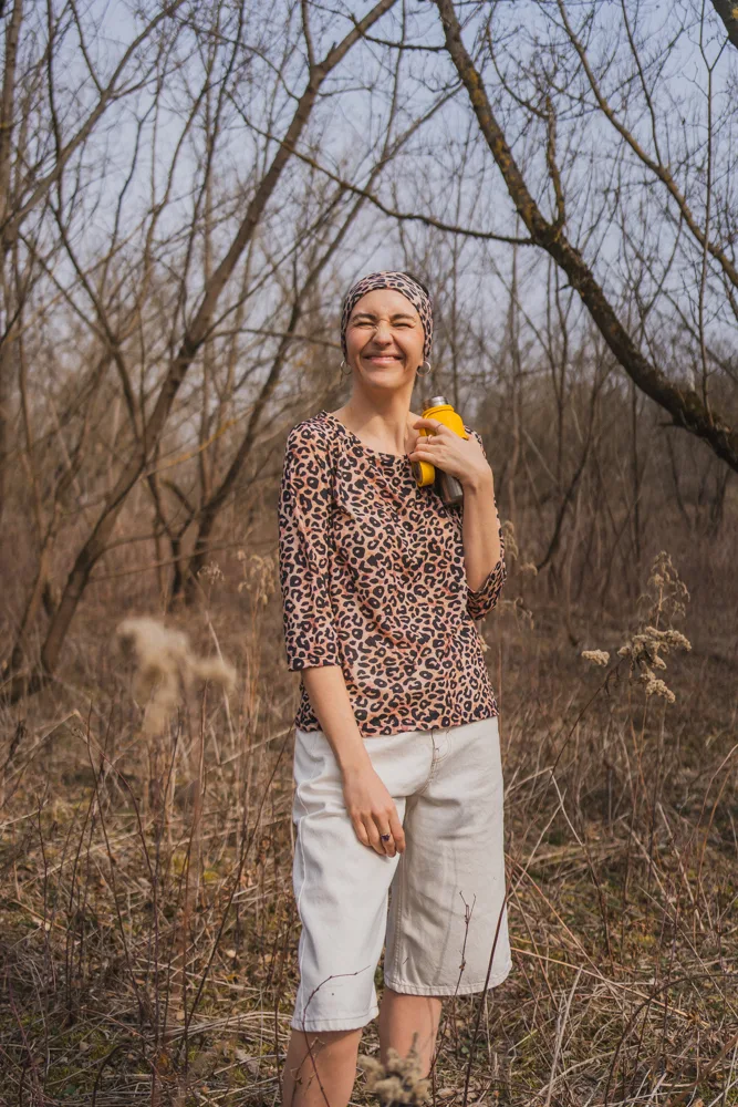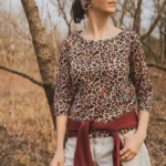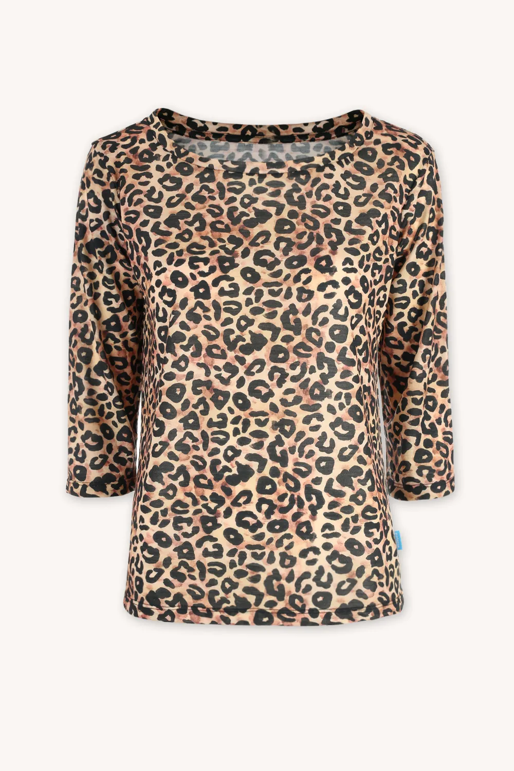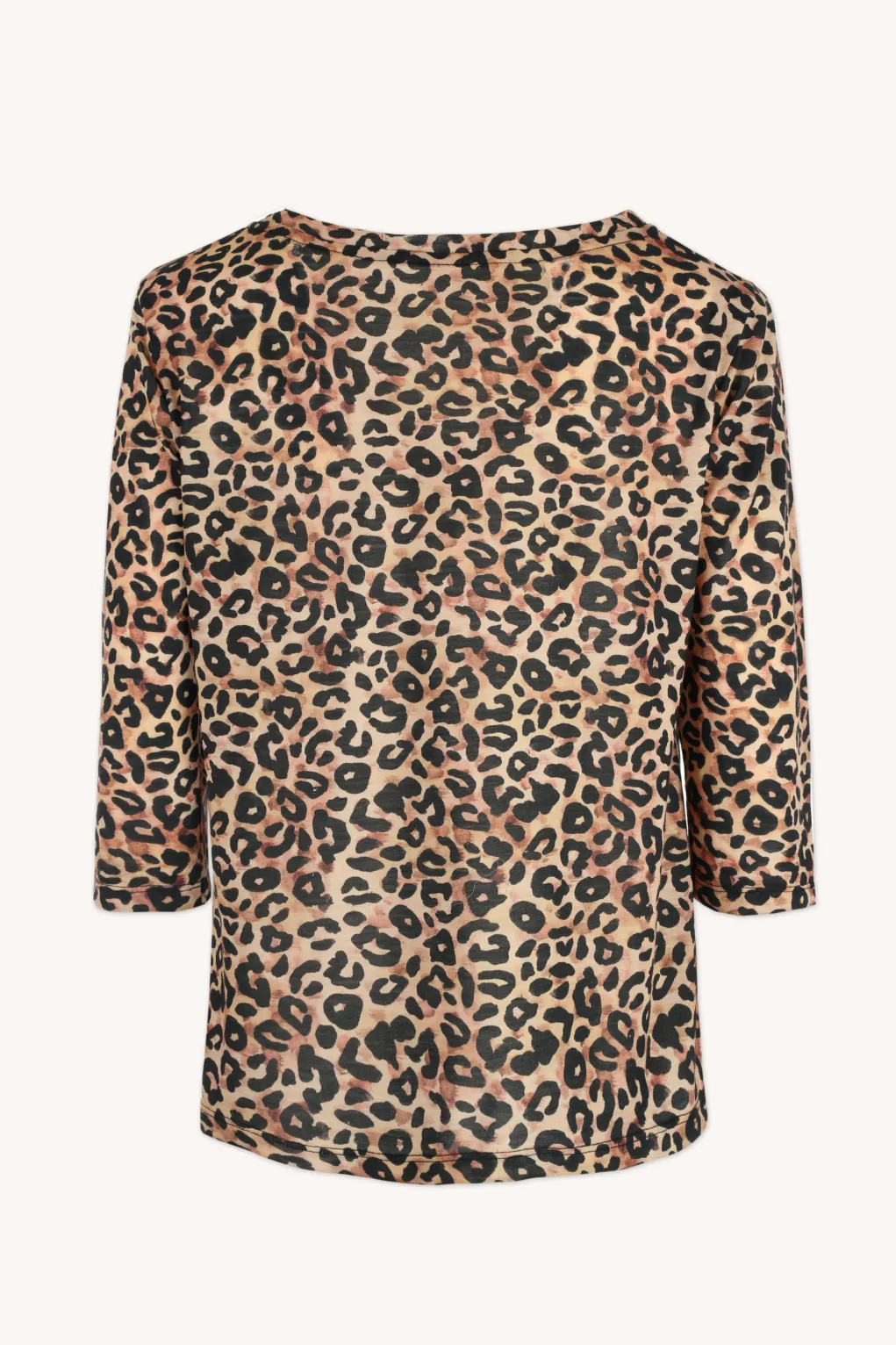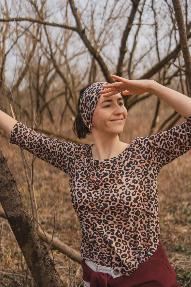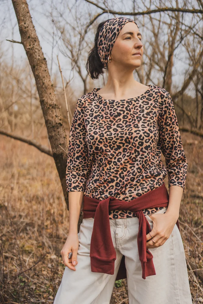 Koszulka z wełny merino z dekoltem w łódkę i rękawem ¾ we wzór w panterkę. Wykonana z miękkiej, delikatnej wełny merino, ta koszulka zapewnia niezrównany komfort przez cały dzień.