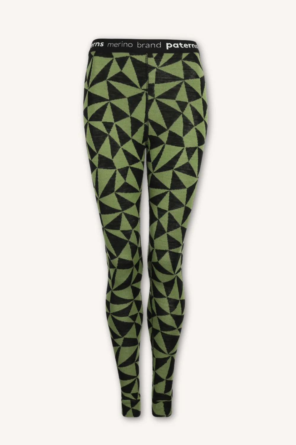 Bardzo ciepłe, termoaktywne legginsy damskie z wełny merino z wysokim stanem we wzór w oliwkowo-czarne trójkąty. Dół bielizny 100% z wełny merino sprawdzi się doskonale podczas jesiennych trekkingów albo jako warstwa dogrzewająca pod narciarski kombinezon.