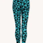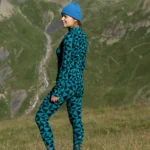 Bardzo ciepłe, termoaktywne legginsy damskie z wełny merino z wysokim stanem we wzór w turkusowo-czarne trójkąty. Dół bielizny 100% z wełny merino sprawdzi się doskonale podczas jesiennych trekkingów albo jako warstwa dogrzewająca pod narciarski kombinezon.
