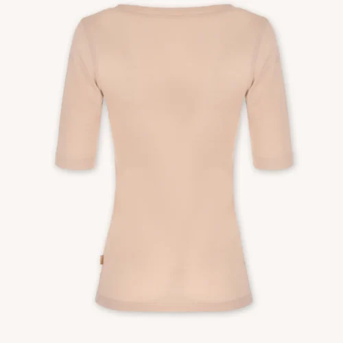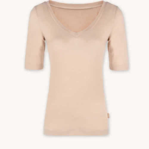 Neutralny, cielisty kolor sprawia, że koszulka znika pod jasnymi i cienkimi ubraniami – jest niewidoczna nawet pod białą bluzką. Kobiecy dekolt w serek oraz dopasowany krój sprawiają, że to uniwersalna, codzienna warstwa, którą nosi się z przyjemnością. Świetna opcja dla osób ceniących komfort, naturalne tkaniny i subtelną estetykę.