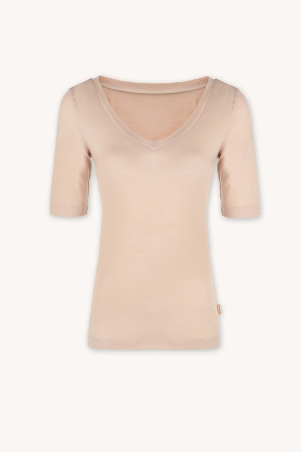Dzięki uniwersalnemu krojowi i funkcjonalnym właściwościom, ta cielista merino koszulka z krótkim rękawem i z dekoltem V doskonale sprawdzi się jako bazowa warstwa w chłodniejsze dni lub dyskretna, codzienna opcja do noszenia pod ubraniem.