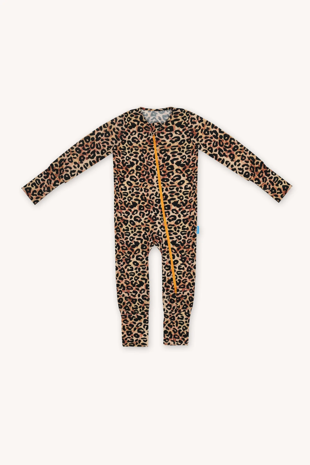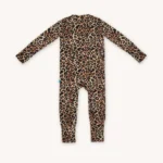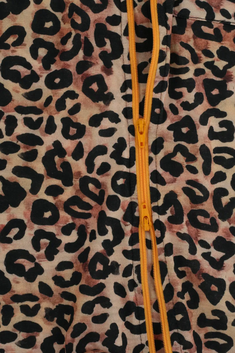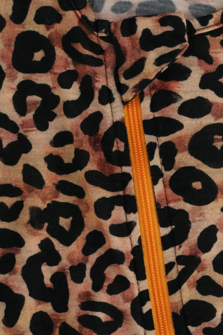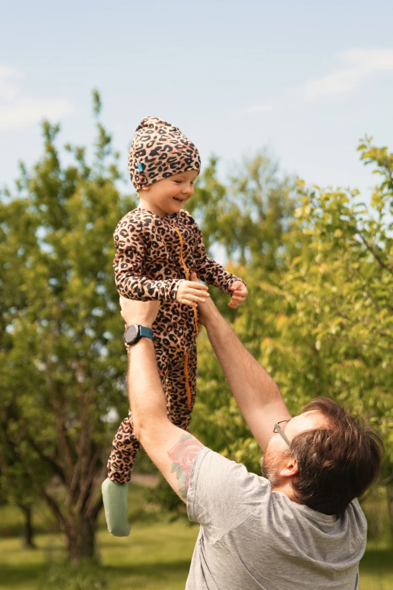 Cienki rampers dziecięcy z wełny merino w panterkę. Zapinanie na ukośny suwak sprawia, że szybko i łatwo go założysz i zdejmiesz. Ma wywijane mankiety na nogawkach i rękawach, dzięki czemu starczy na dłużej i będzie rósł razem z dzieckiem! Jest dopasowany i elastyczny. Idealny pod kombinezon i do noszenia solo.