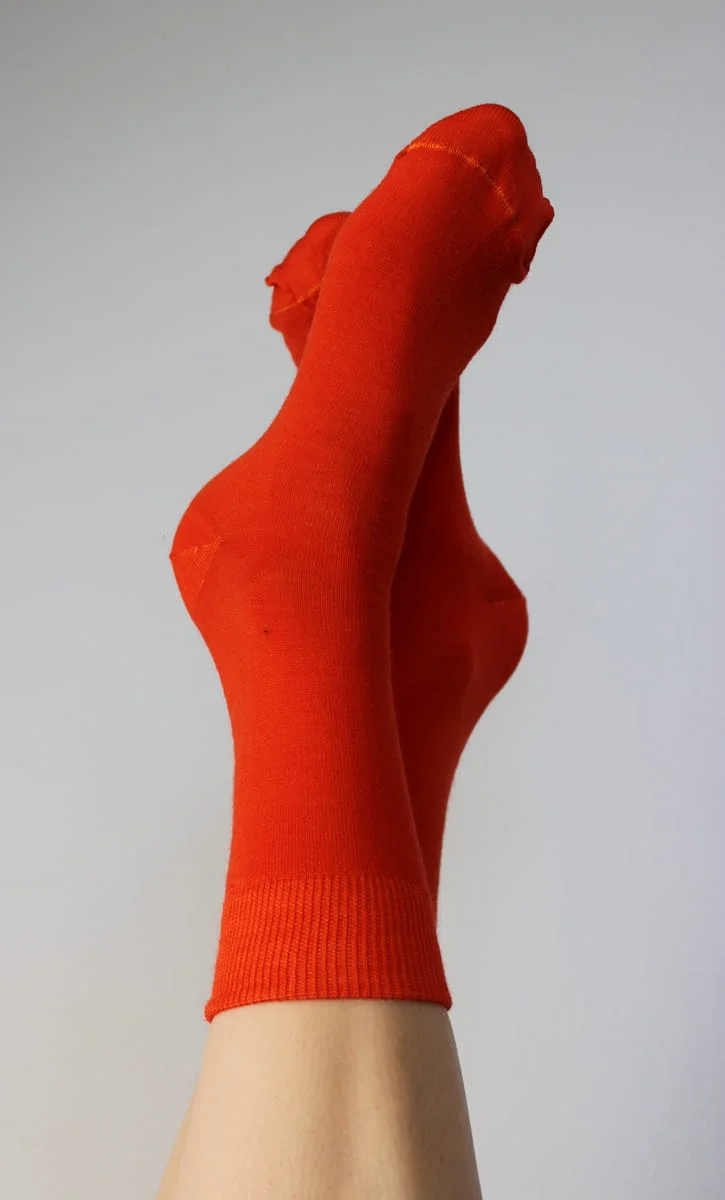 Skarpetki wykonane z wełny merino wyprodukowane w Polsce w pomarańczowym kolorze. Jeśli ciągle marzną Ci stopy albo masz problem z pocącymi się stopami – te skarpetki będą dla Ciebie wybawieniem.