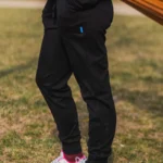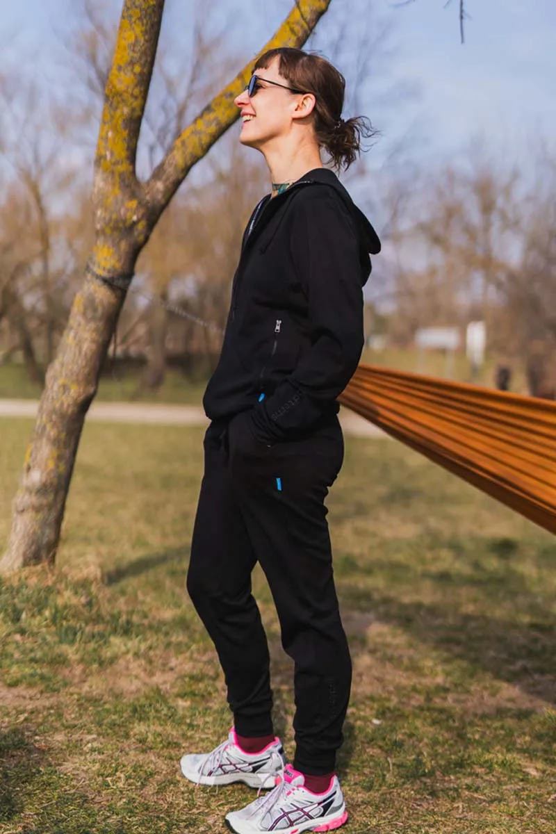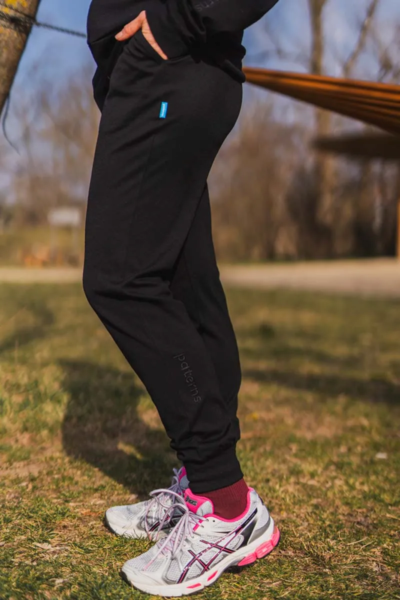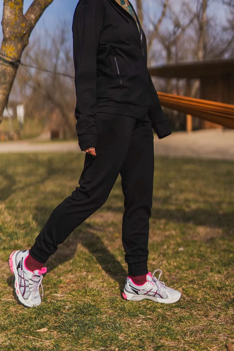 Czarne, dresowe spodnie wykonane w 100% z wełny merino, absolutnie idealne. Powstały w komplecie z bluzą z wełny merynosów.