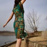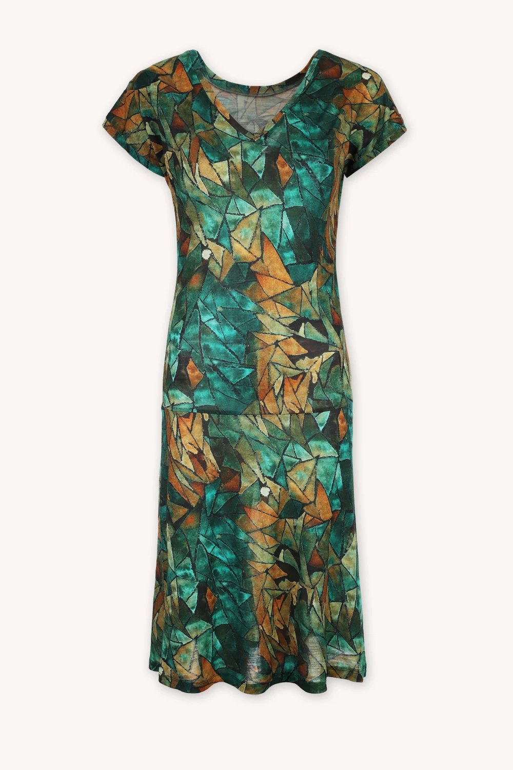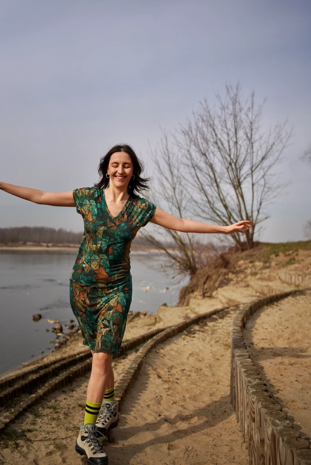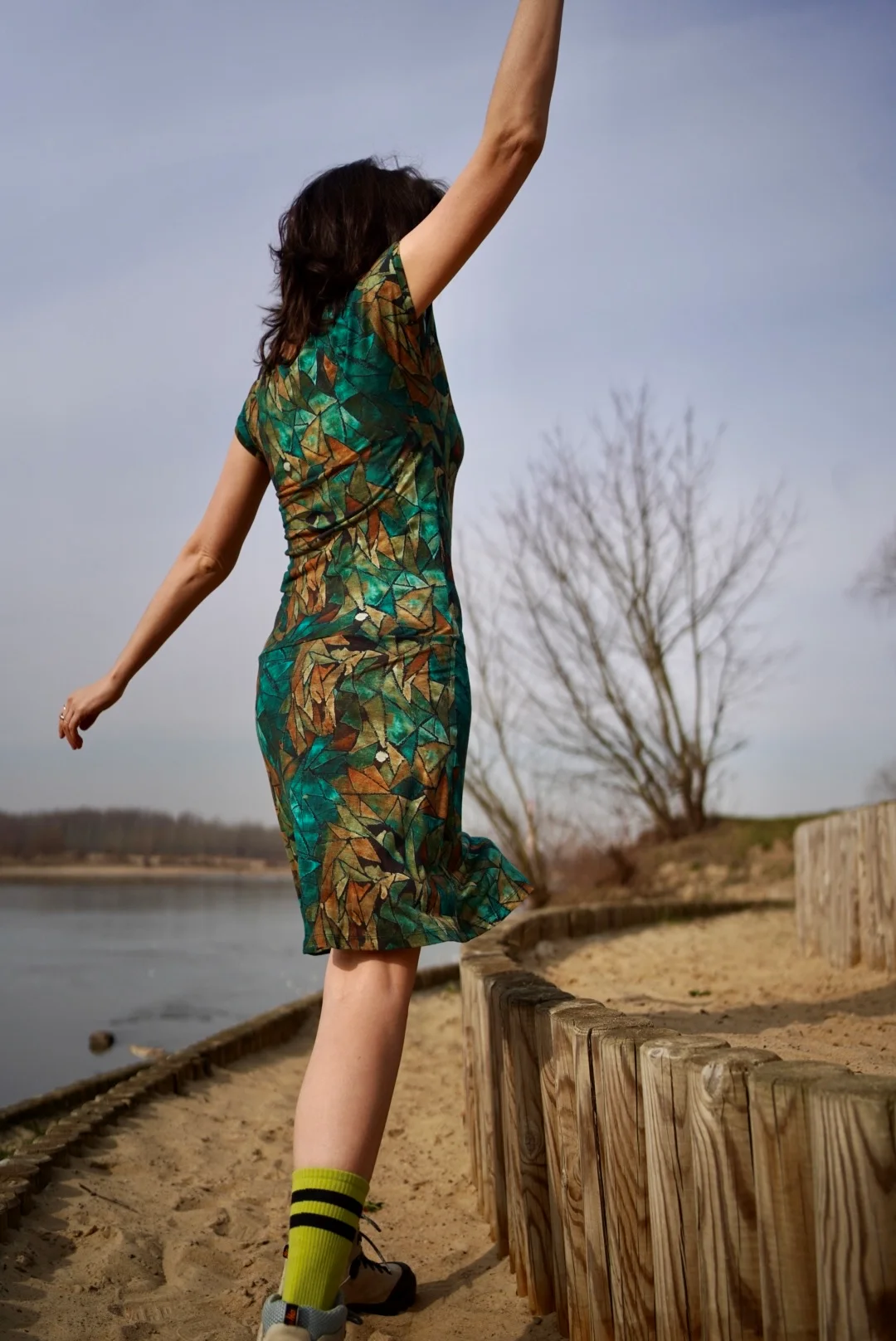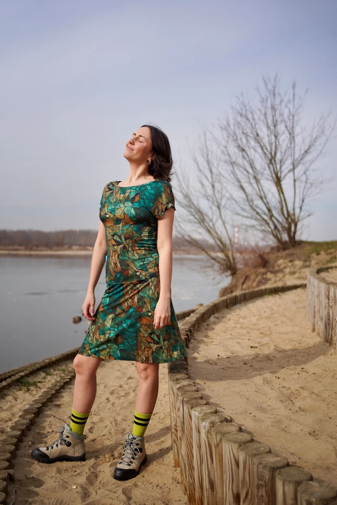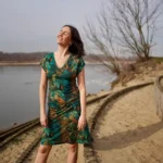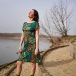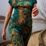 Prosta sukienka z dekoltem V wykonana 100% z wełny merino we wzór green gorpcore. Lekka, miękka, miła w dotyku. Jest jak druga skóra, w ogóle nie poczujesz, że masz ją na sobie.
