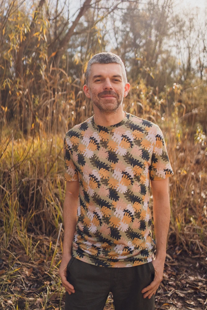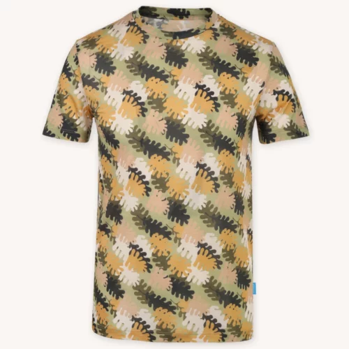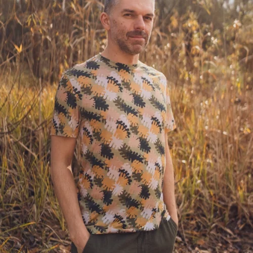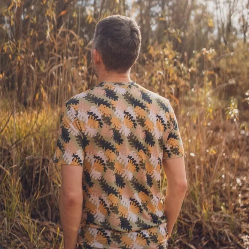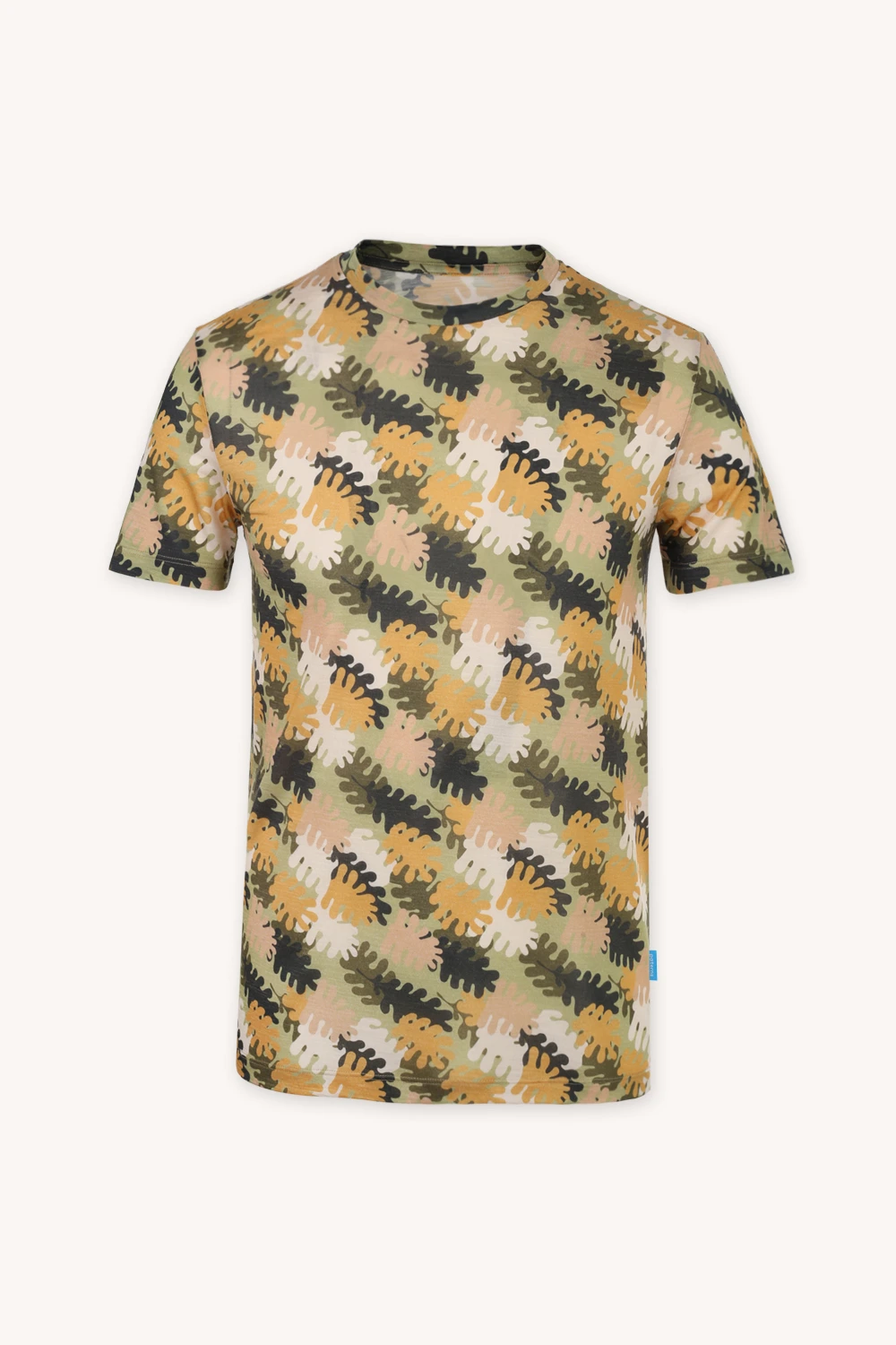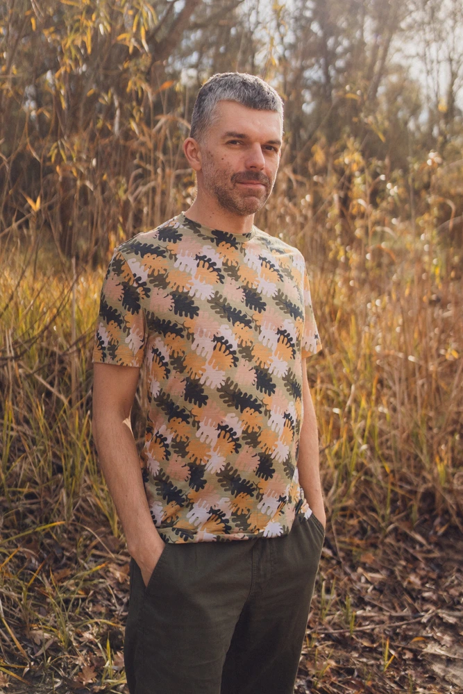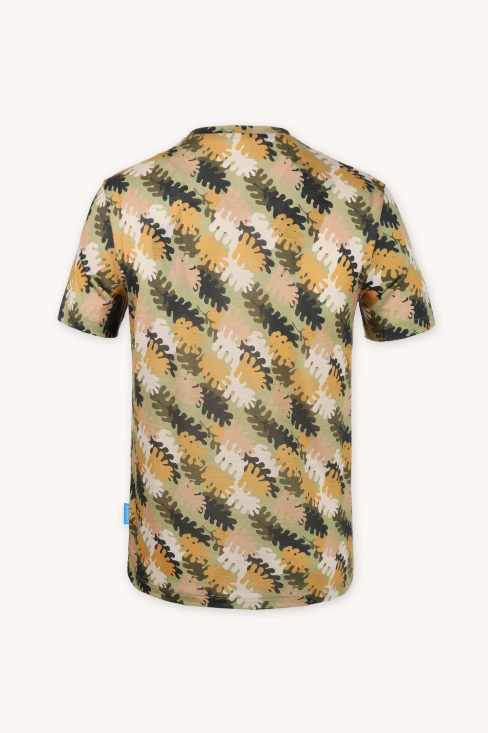 T-shirt męski z wełny merynosów we wzór w liście zdecydowanie powinien znaleźć się w Twojej szafie.